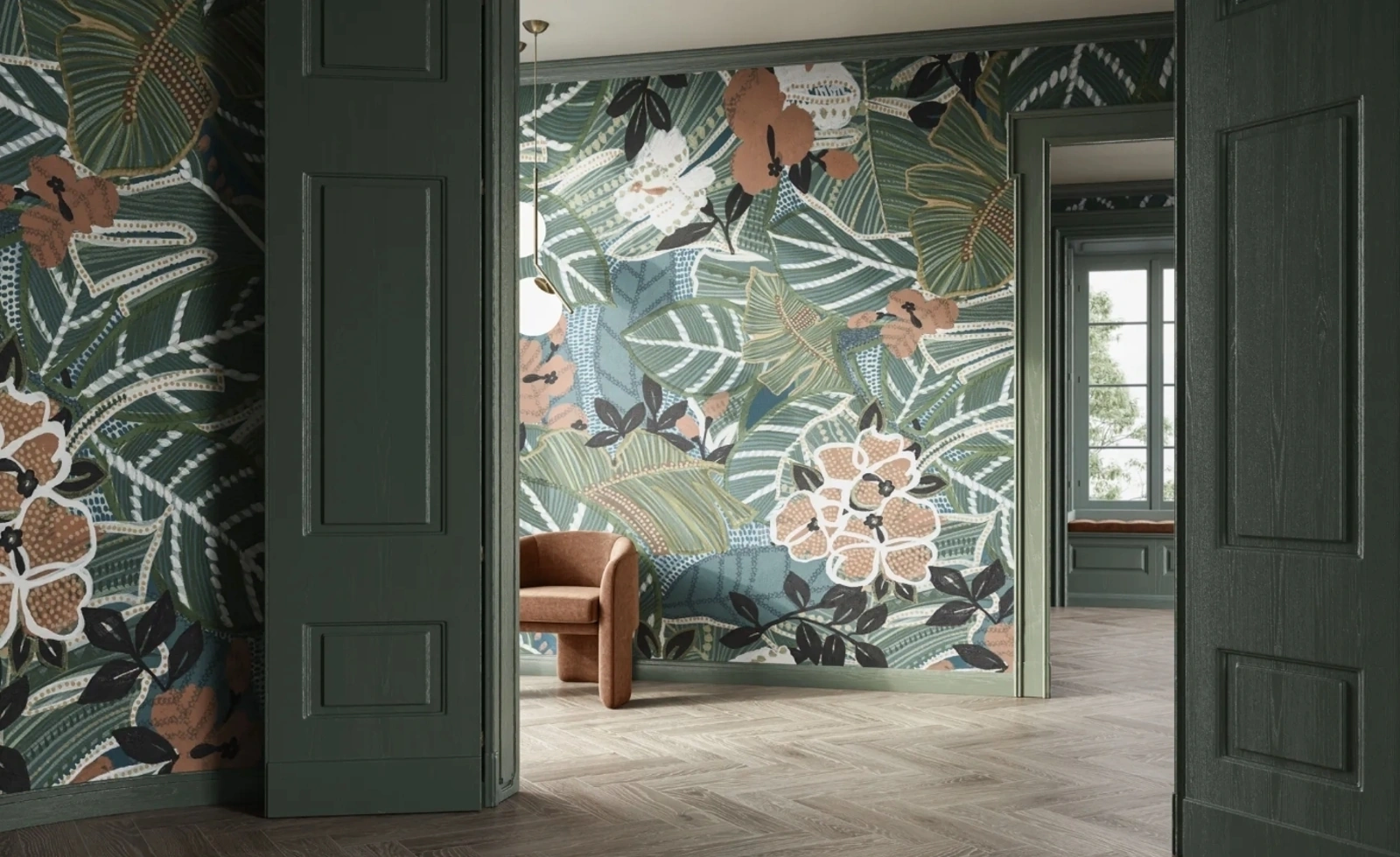 La Carta da parati è la soluzione ottimale per valorizzare i tuoi locali! Ultima un'ambientazione moderna con il modello Kew Gardens di Glamora.