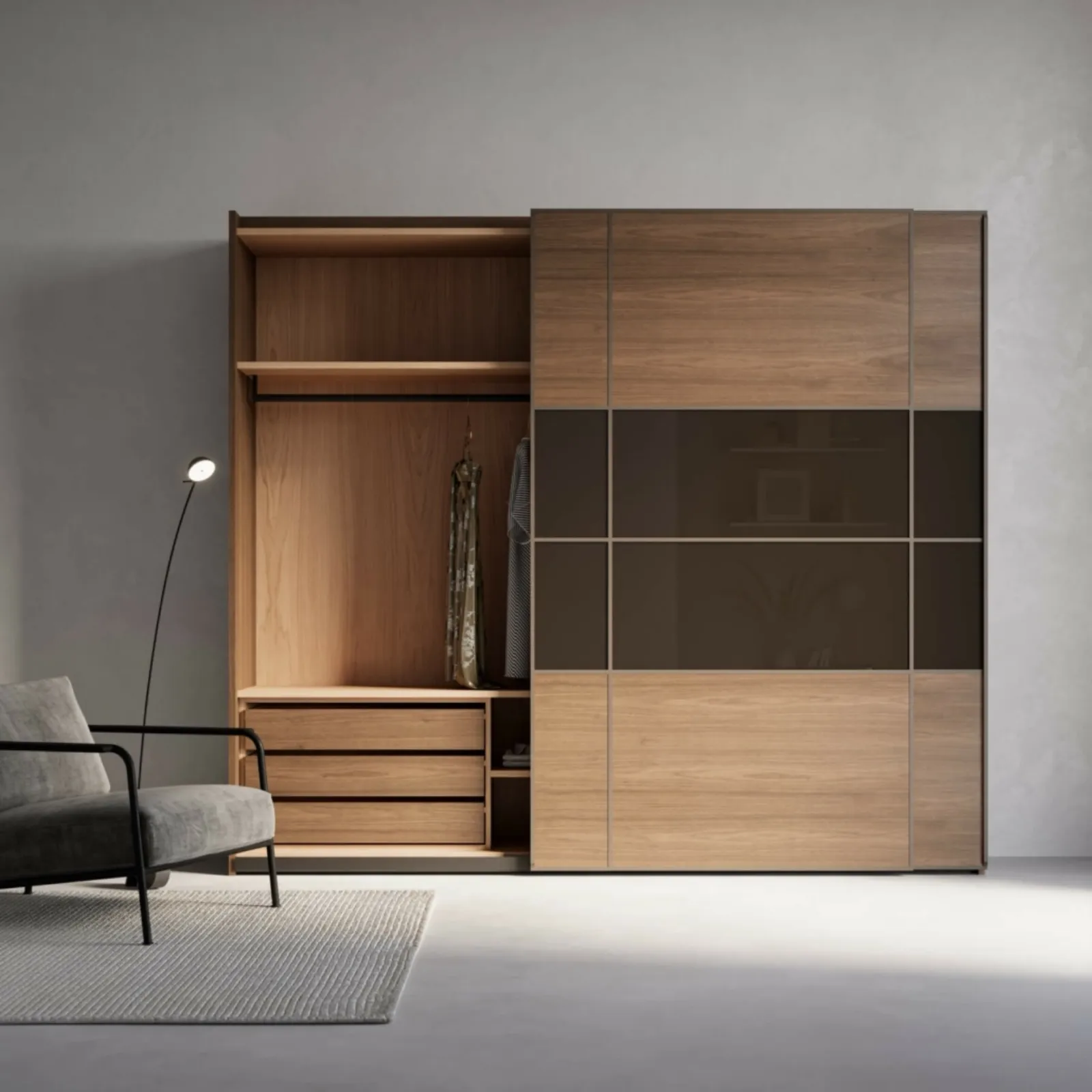 Se cerchi armadiature a muro con ante scorrevoli, clicca e scopri l'armadio Leonardo Vetro di Arte Brotto in legno.