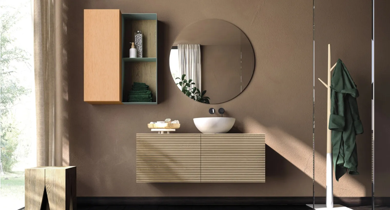 Devina Nais produce progetti per l’Arredo Bagno moderno con mobili bagno sospesi che uniscono design unico e grande ergonomia, come questo interno vuole.