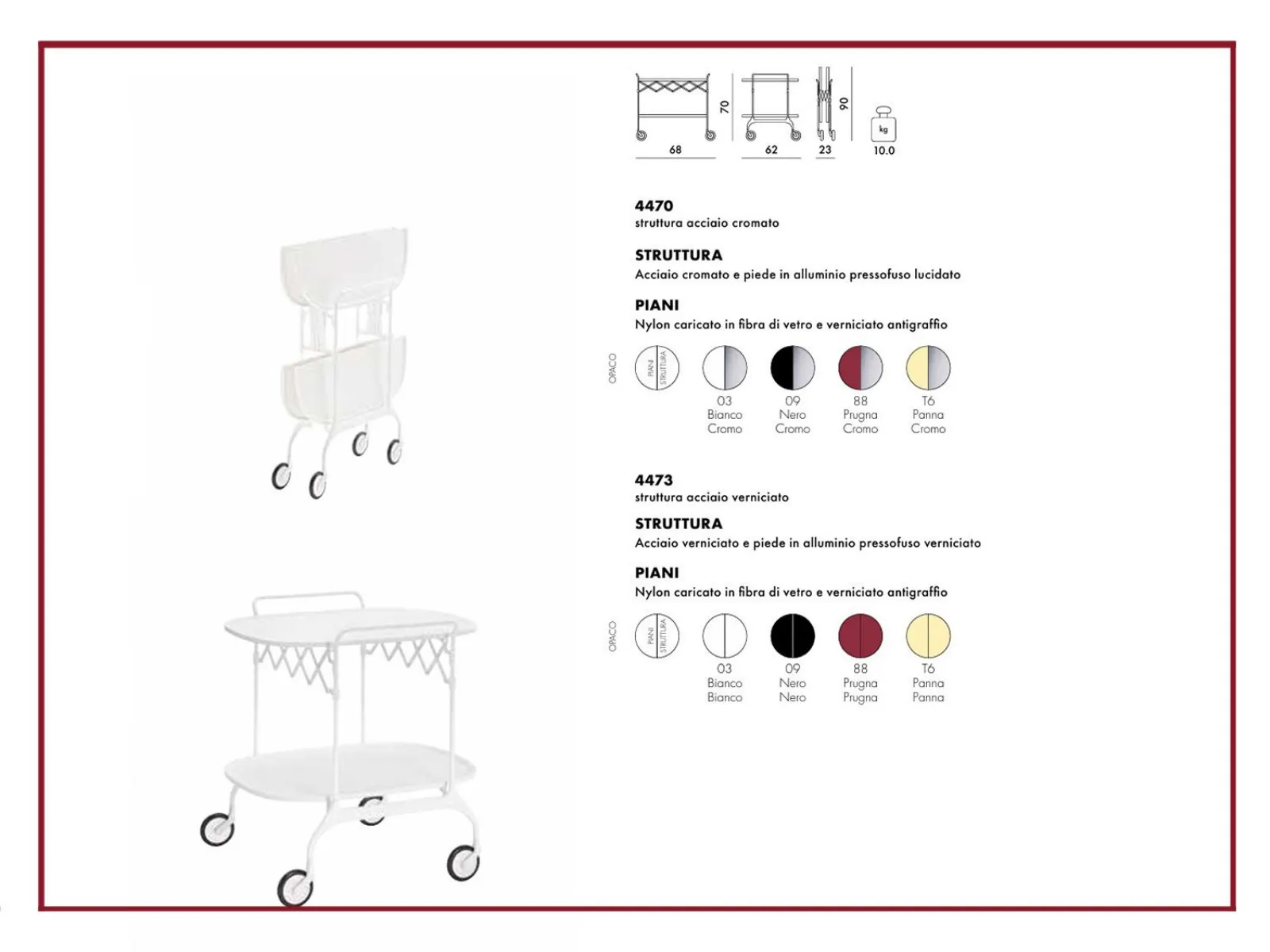 Realizzato con un piano in materiale plastico verniciato e una struttura in metallo cromato, Gastone è pensato per adattarsi con disinvoltura agli ambienti più diversi, dal living moderno alla cucina contemporanea.