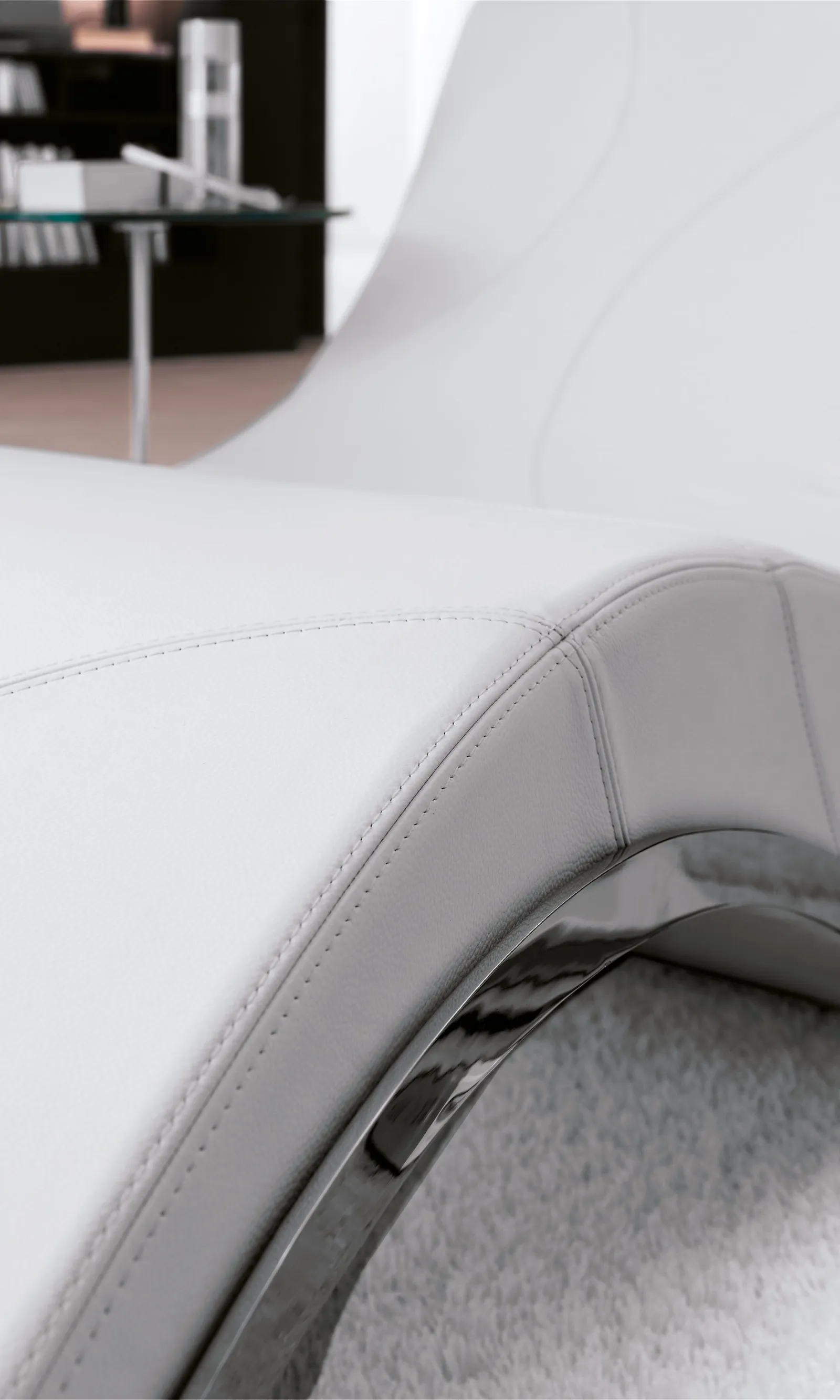 Il dettaglio in acciaio cromato delinea un profilo sinuoso, come un'onda, mentre eleganti cuciture decorative sono espressione della manifattura d'eccellenza italiana. Questa chaise longue di design, pensata per vestire ogni ambiente della casa dalla camera, al salotto, allo studio, è disponibile in un'ampia varietà di pregiate finiture.