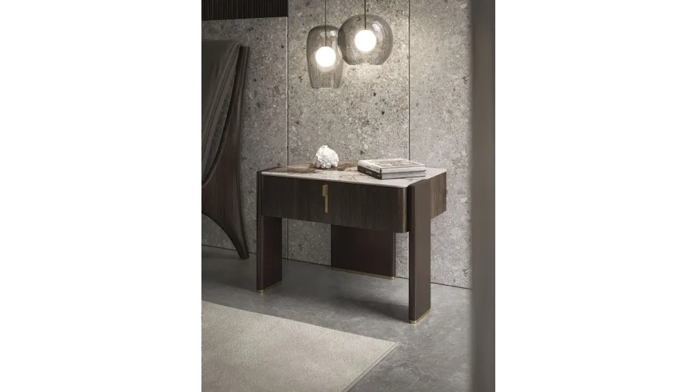 Comodino a un cassetto in noce Canaletto (NC) o rovere bruciato (RB). Struttura in legno verniciato goffrato bronzo (GF18) e particolari in acciaio verniciato ottone. Top in ceramica Marmi nei colori Portoro opaco (KM07), Corcovado (KM14), Colosseo (KM21) o in cristallo specchiato bronzo.