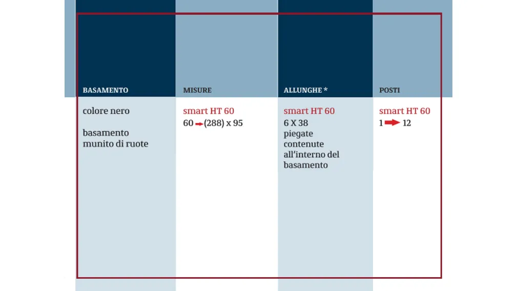 (allungabile fino a cm. 288 x cm.95 (6 prolunghe contenute all’interno del tavolo, da 4 > 12 posti)