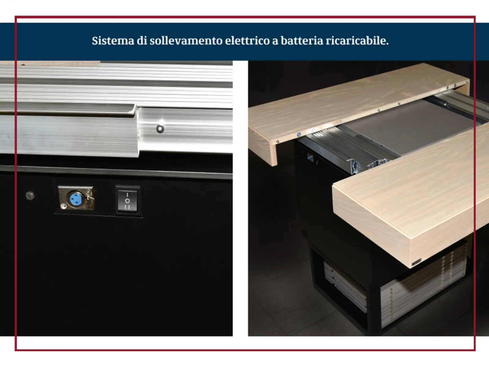 L’alzata del tavolo avviene elettricamente senza uso di fili di corrente, ma con batterie ricaricabili, facilmente sostituibili.