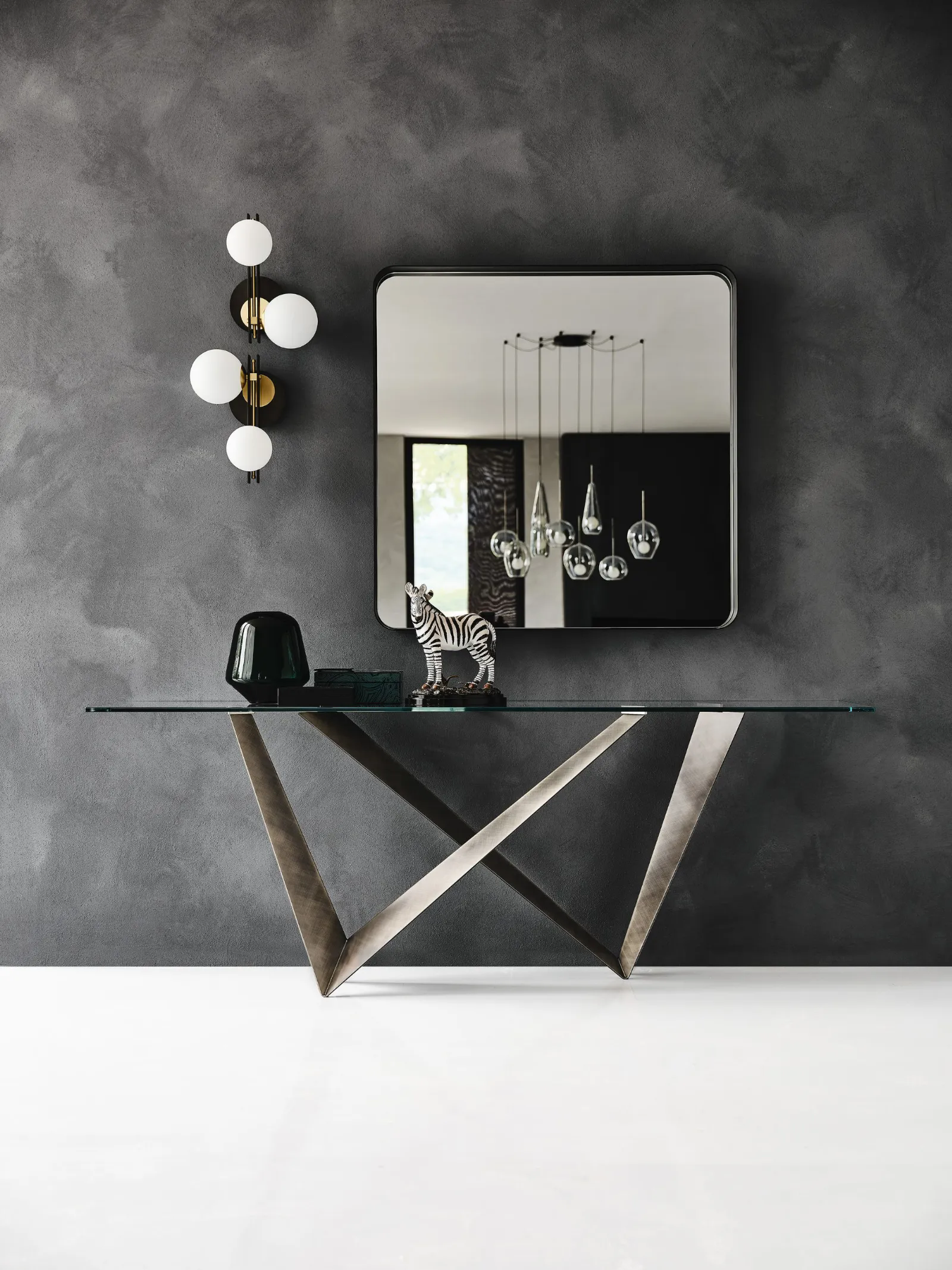 La consolle Westin di Cattelan Italia, realizzato con la base acciaio verniciato goffrato titanio (GFM11), bronzo (GFM18), graphite (GFM69), pearl (GFM70), nero (GFM73), Brushed Bronze o Brushed Grey.