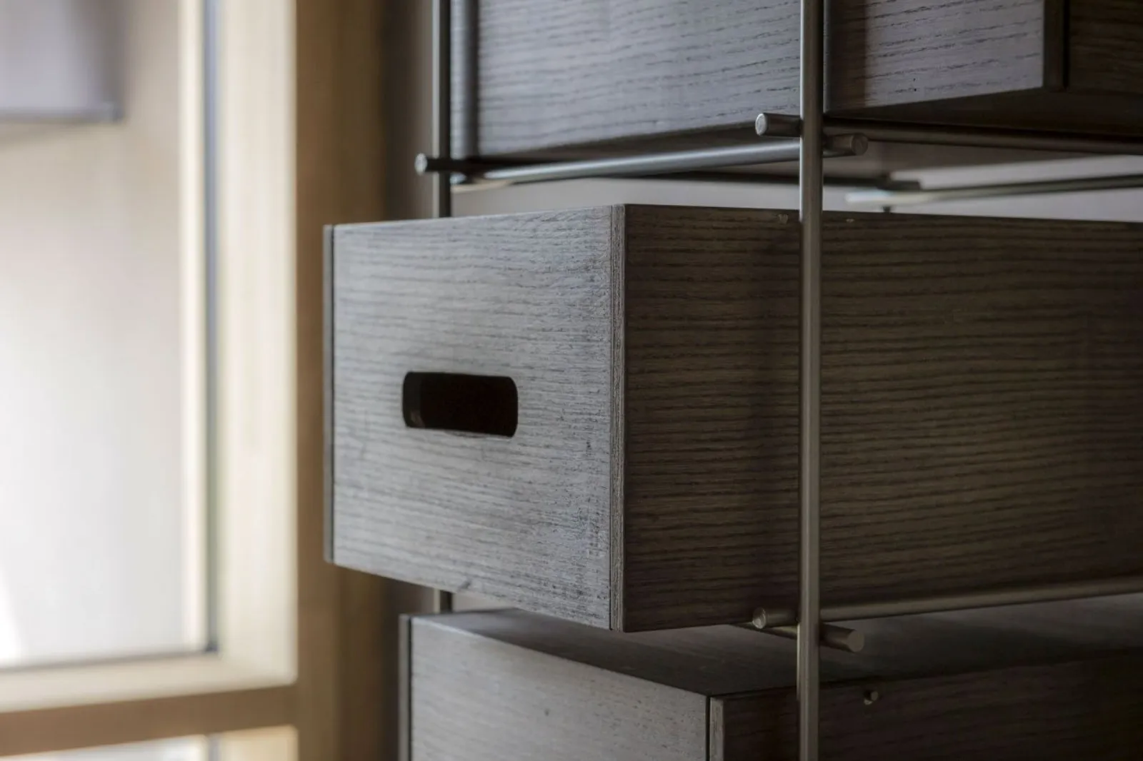 Manolo è una scarpiera con struttura in metallo brunito e cassetti in massello di frassino tinto moka.