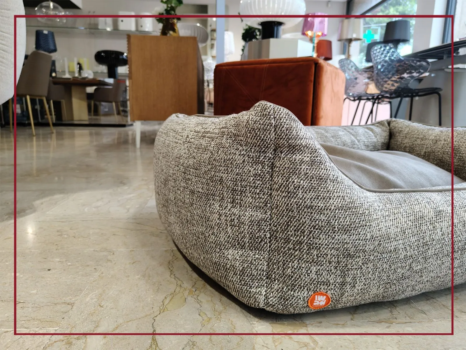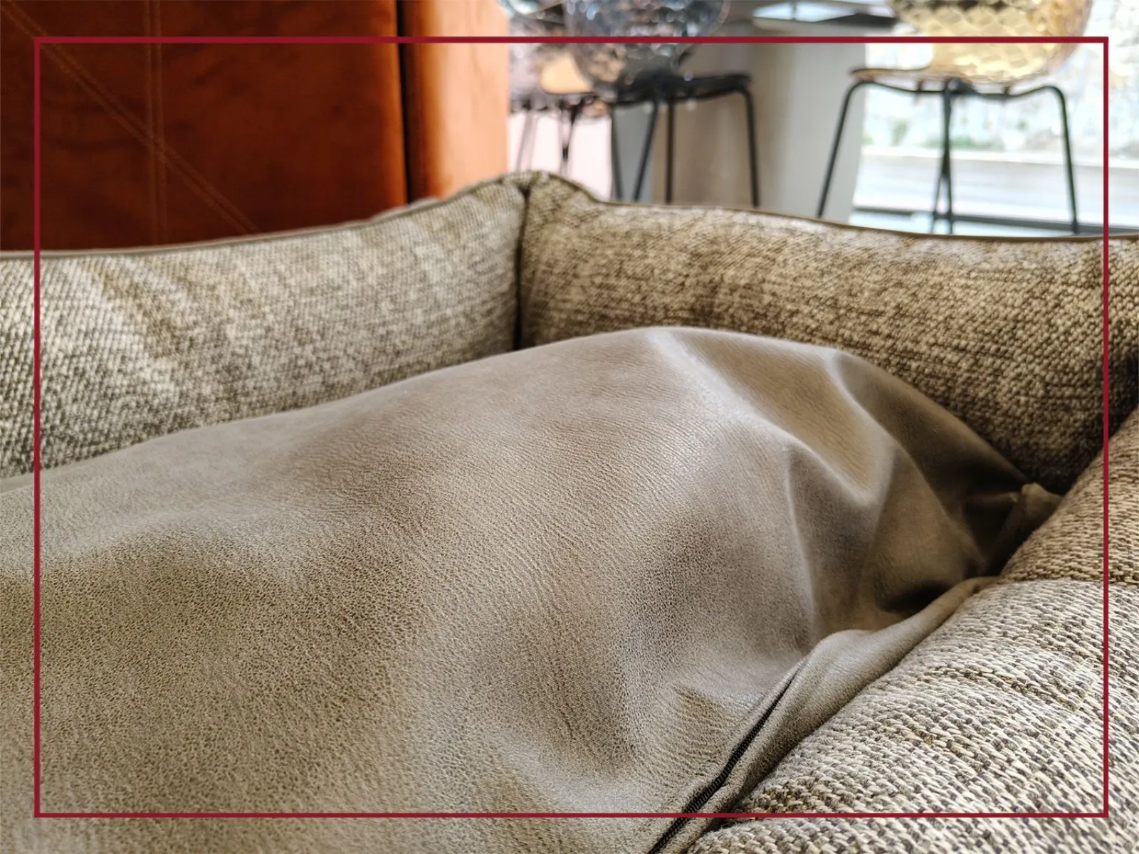 Parte del progetto eco-sostenibile di I Was A Divano, questa cuccia è realizzata artigianalmente con tessuti riciclati provenienti dalla produzione di divani Egoitaliano, dimostrando che eleganza e rispetto per l’ambiente possono convivere.
