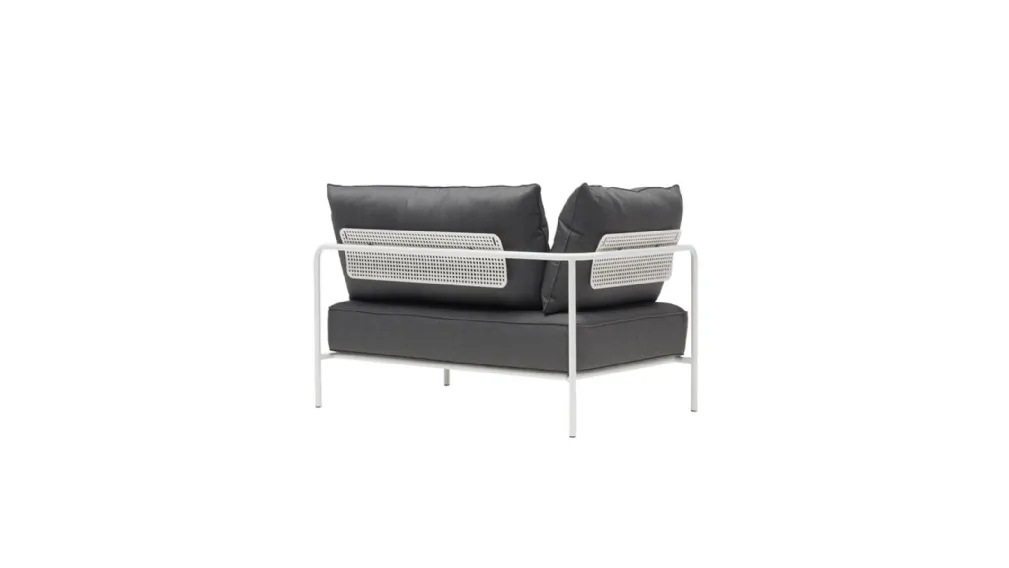 Flap di Meneghello Paolelli è una collezione di imbottiti modulari in cui gli elementi di seduta si combinano in composizione ai piani d’appoggio. Alla struttura essenziale sono fissate nella parte dello schienale degli elementi che ricordano nella forma i flap degli aerei, con funzione di supporto della cuscineria posteriore, e che possono ruotare sull’asse di circa 15 gradi: ciò consente al cuscino di avere differenti inclinazioni per raggiungere il miglior grado di comfort possibile. Una seduta adatta a diversi contesti d’uso sia nel residenziale che nel contract. I rivestimenti dei cuscini dai volumi generosi sono proposti in texture differenti accuratamente selezionate per inserirsi armoniosamente in ambienti outdoor classici o contemporanei. Cuscineria in tessuto acrilico per uso outdoor. Tavolino d’appoggio con telaio in acciaio verniciato e piano in HPL.