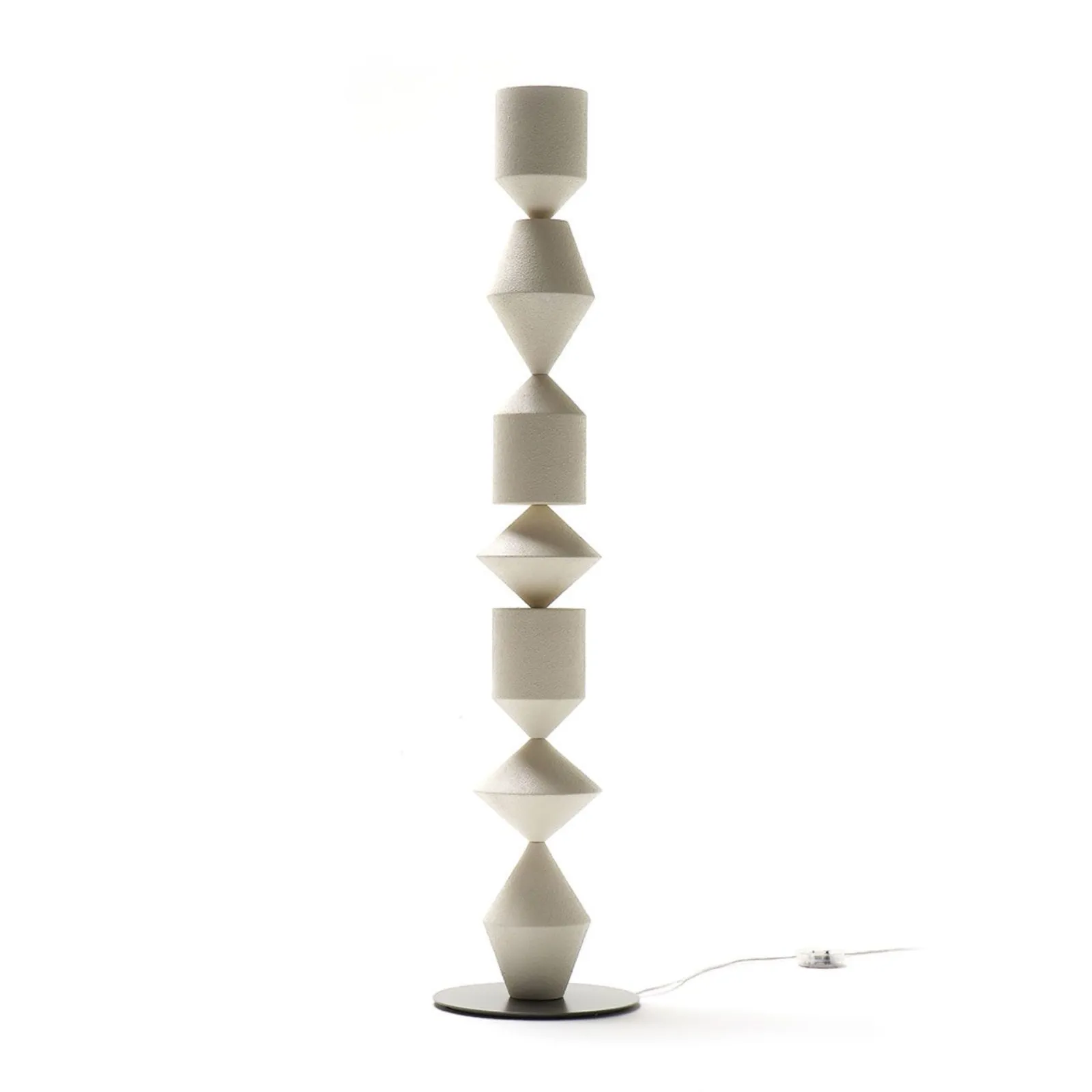 Disponibile in legno massello di Iroko tornito oppure in poliuretano rigido nella finitura materica colore RAL1013 avorio, base in metallo brunito.