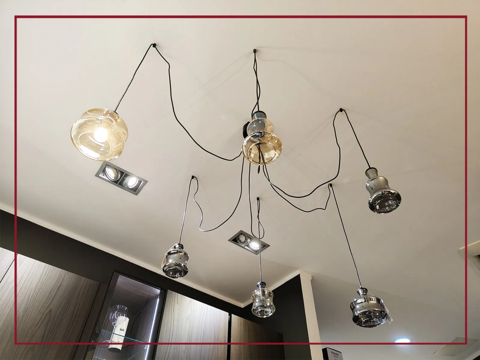 La struttura in metallo nero dona un tocco industriale e sobrio, mentre i cavi regolabili permettono di personalizzare l’altezza e la disposizione, rendendola ideale sia come punto luce singolo che come composizione multipla.