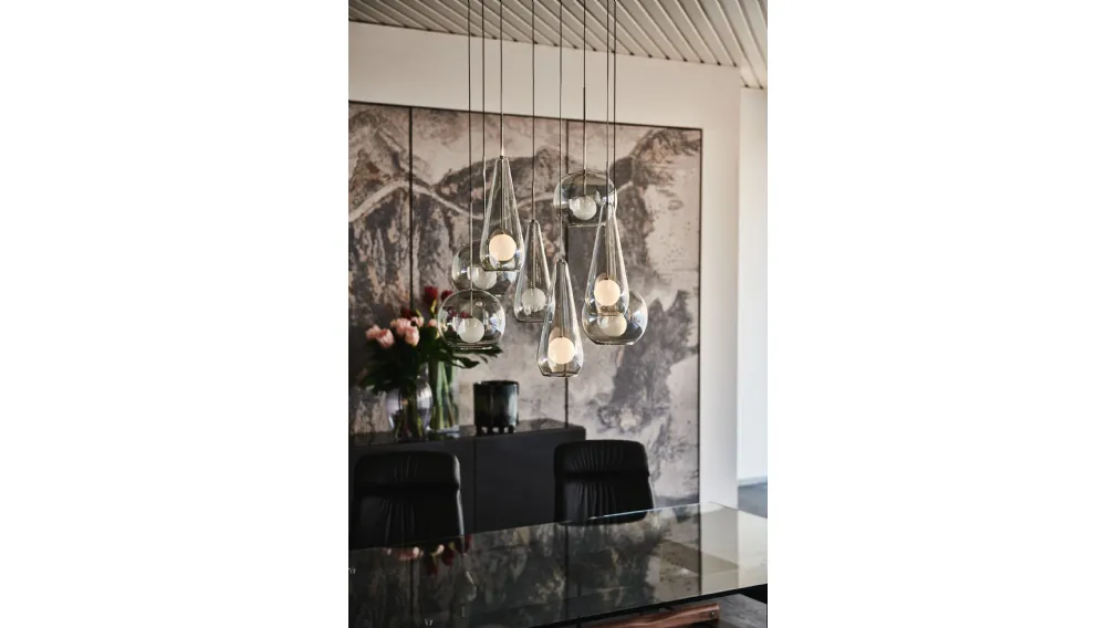 Melody è una composizione dinamica di delicati paralumi in cristallo fumè che sospesi a mezzaria, come note su uno spartito, creano una melodia armoniosa ed elegante. I paralumi sono realizzati in diverse forme e dimensioni, ma un elemento in comune dona un senso di uniformità alla composizione: la lampadina centrale, rotonda come il pallino di una nota musicale. Le lampade di design Melody lasciano la libertà di creare molteplici configurazioni seguendo il proprio gusto personale. Un singolo elemento può essere appeso al soffitto singolarmente o fissato ad un supporto rotondo che ospita da 2 a 12 elementi pendenti, posizionabili a diverse altezze e distanze. Questo elegante lampadario moderno illumina con grande originalità e rende inimitabile un ambiente di design contemporaneo.