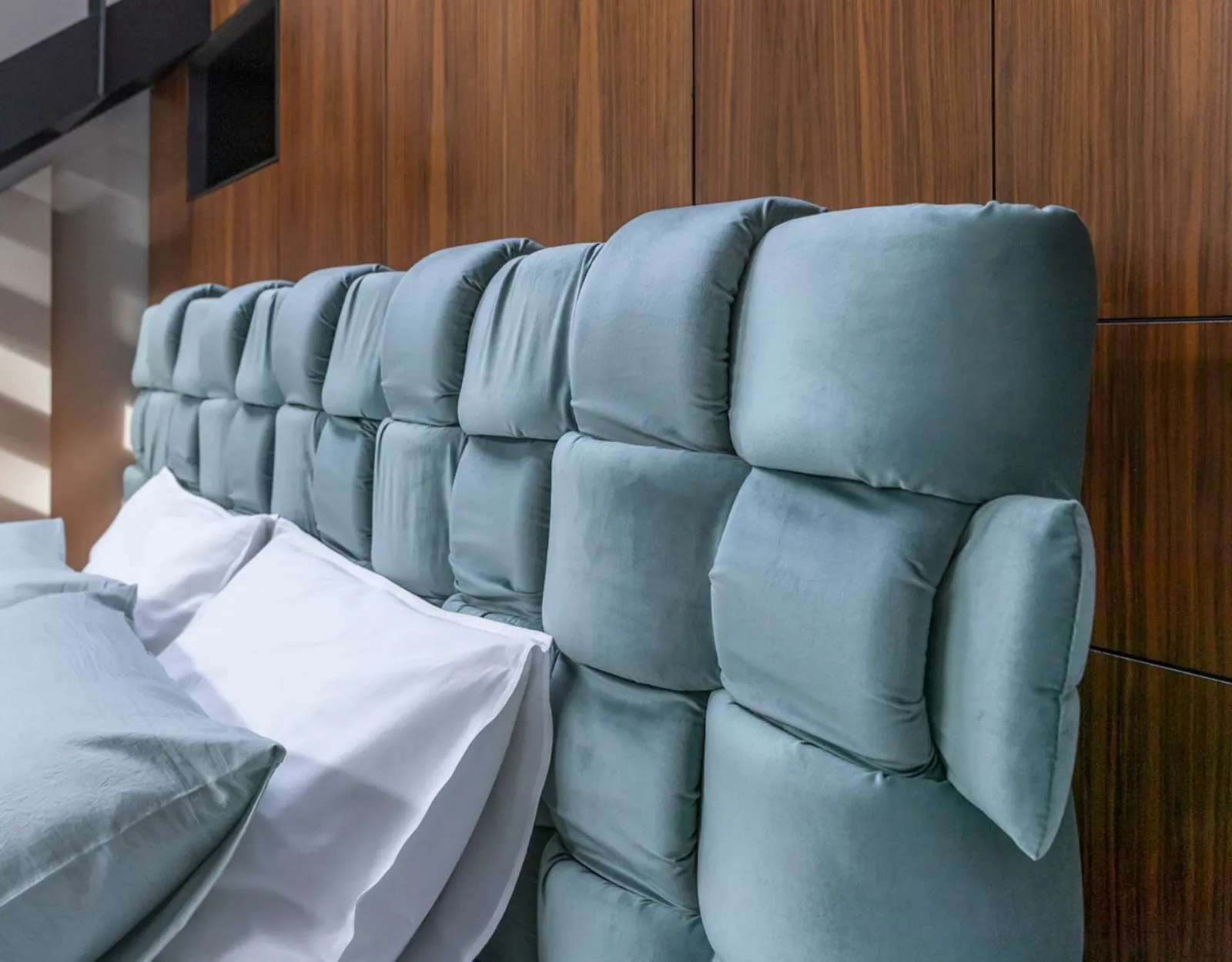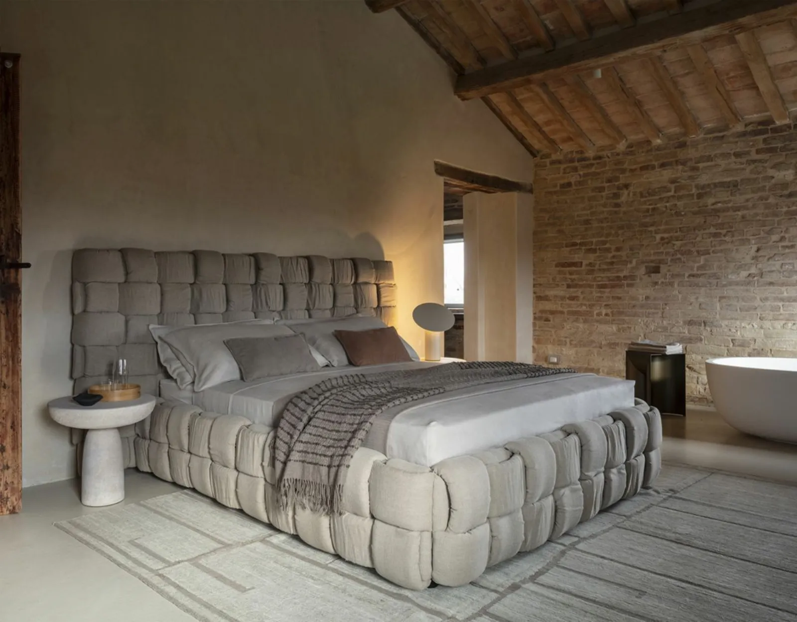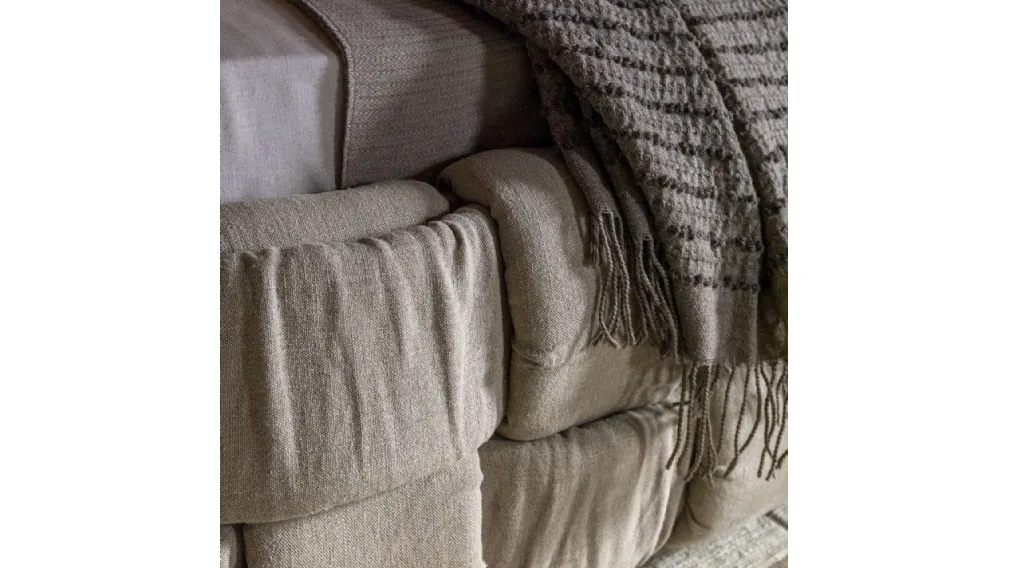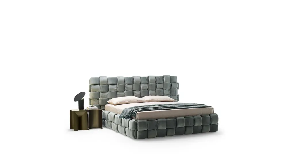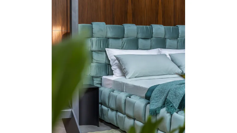 Letto matrimoniale Flirt, trasmette una piacevole sensazione di comfort grazie all’elegante macro intreccio imbottito dell’ampia testiera e del giroletto.