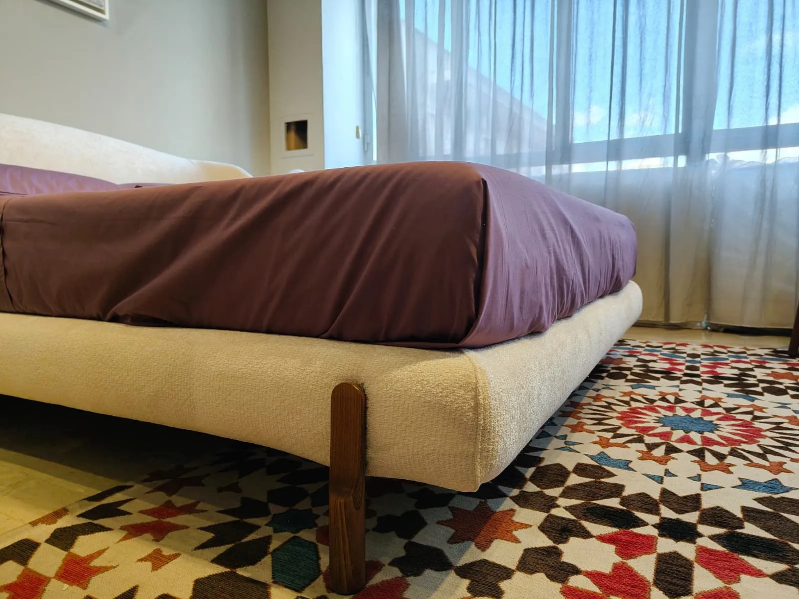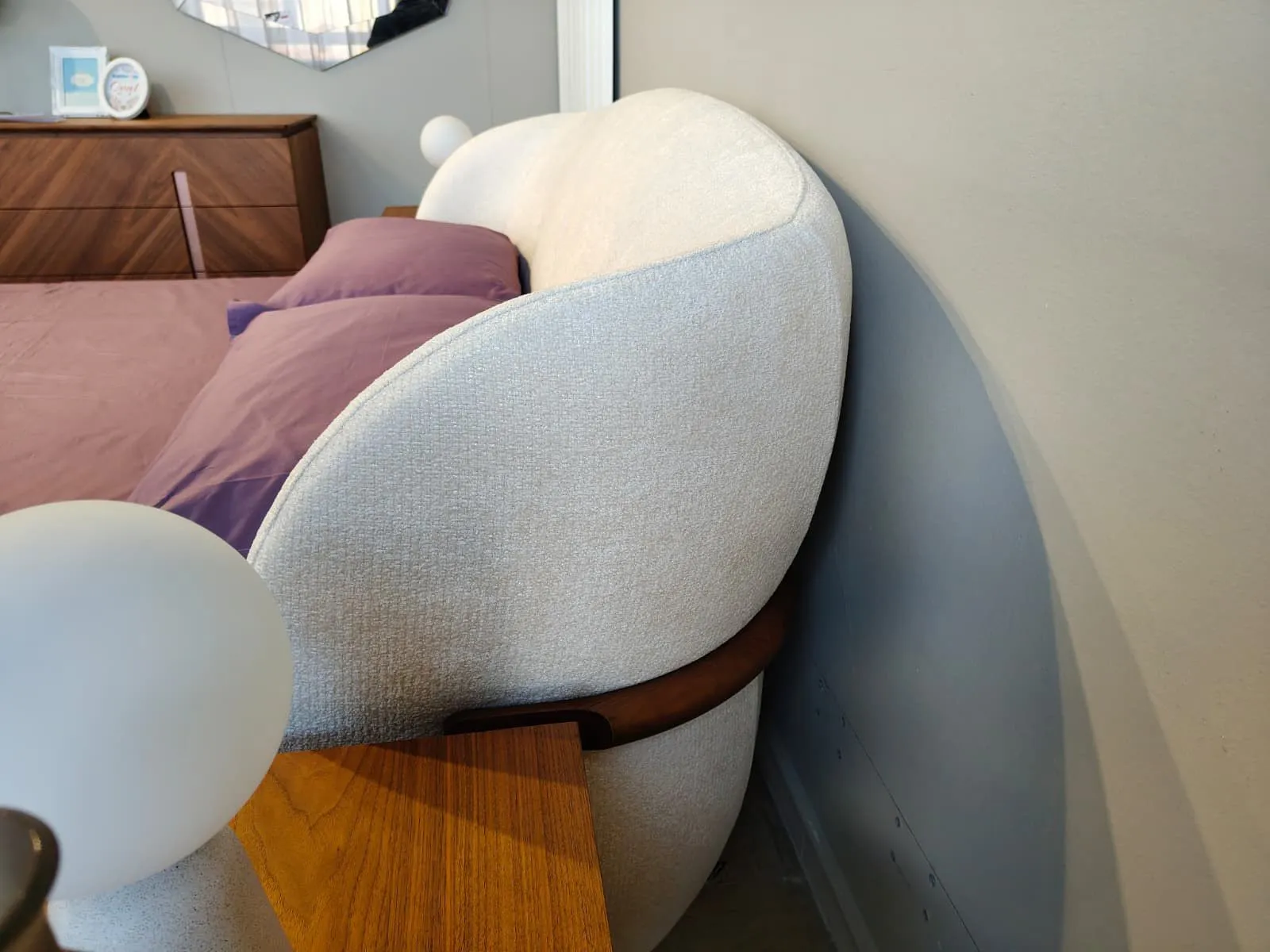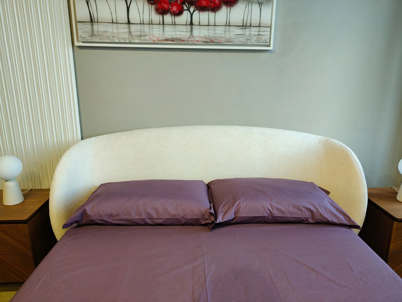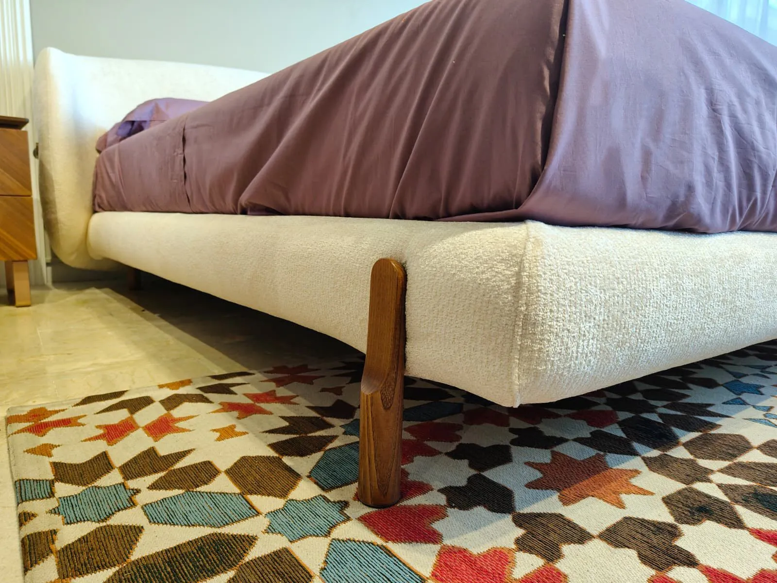 La sua testiera avvolgente è il dettaglio che cattura subito l’attenzione: un morbido schienale imbottito, abbracciato da un elemento orizzontale in legno, che ne sottolinea la forma e ne esalta la morbidezza, creando un equilibrio armonioso tra comfort e design.