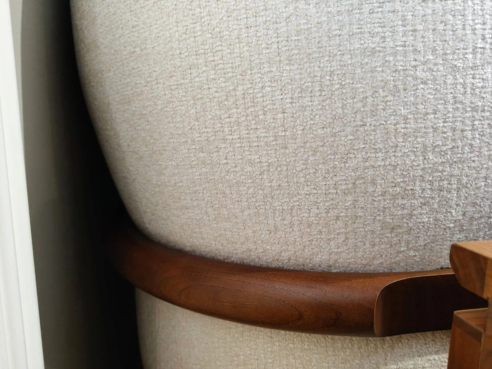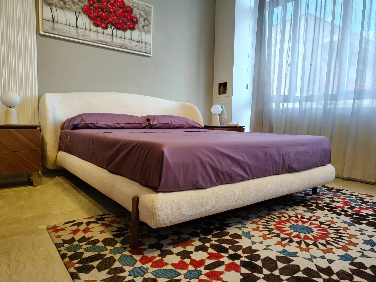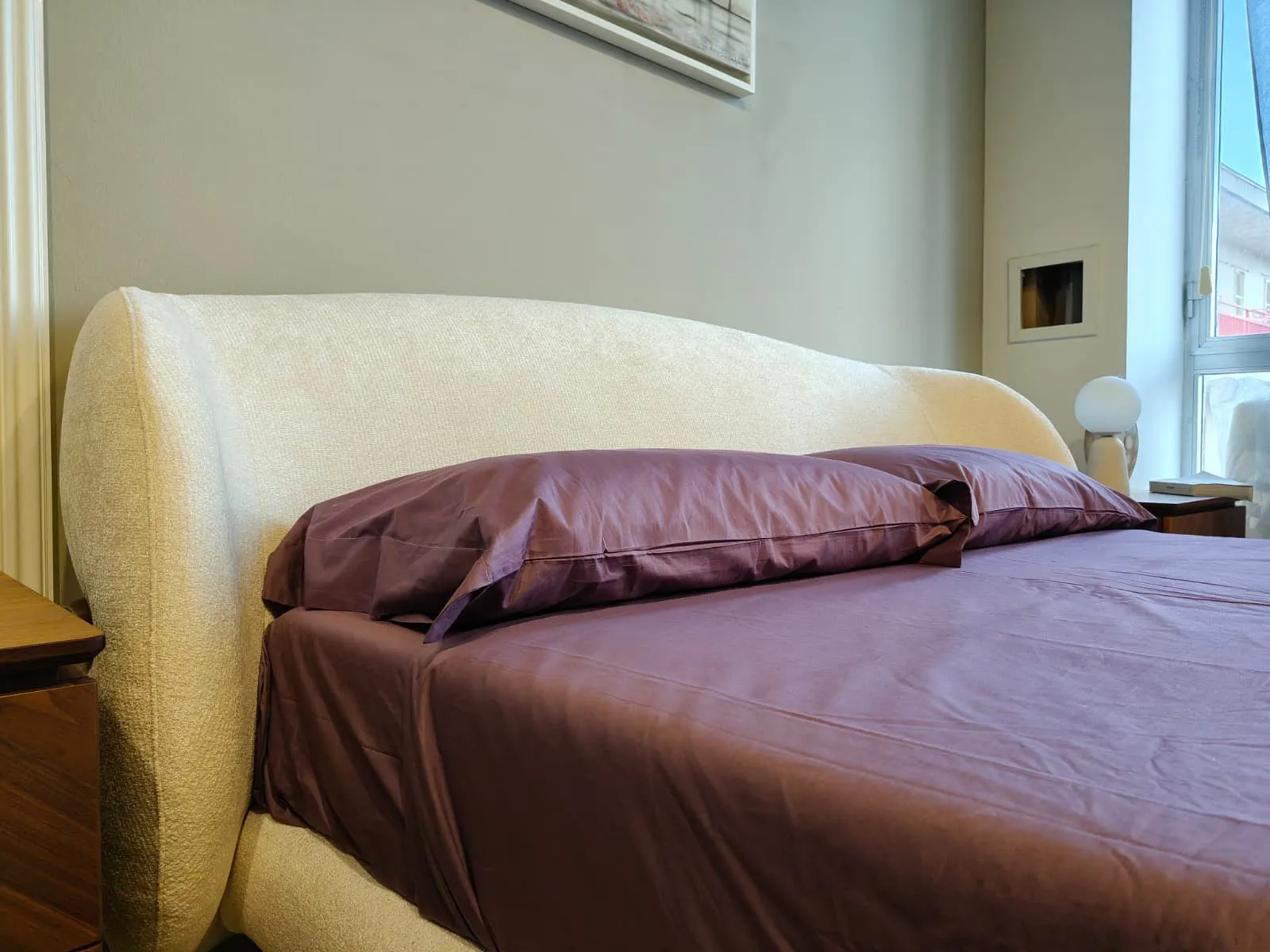 La sua testiera avvolgente è il dettaglio che cattura subito l’attenzione: un morbido schienale imbottito, abbracciato da un elemento orizzontale in legno, che ne sottolinea la forma e ne esalta la morbidezza, creando un equilibrio armonioso tra comfort e design.