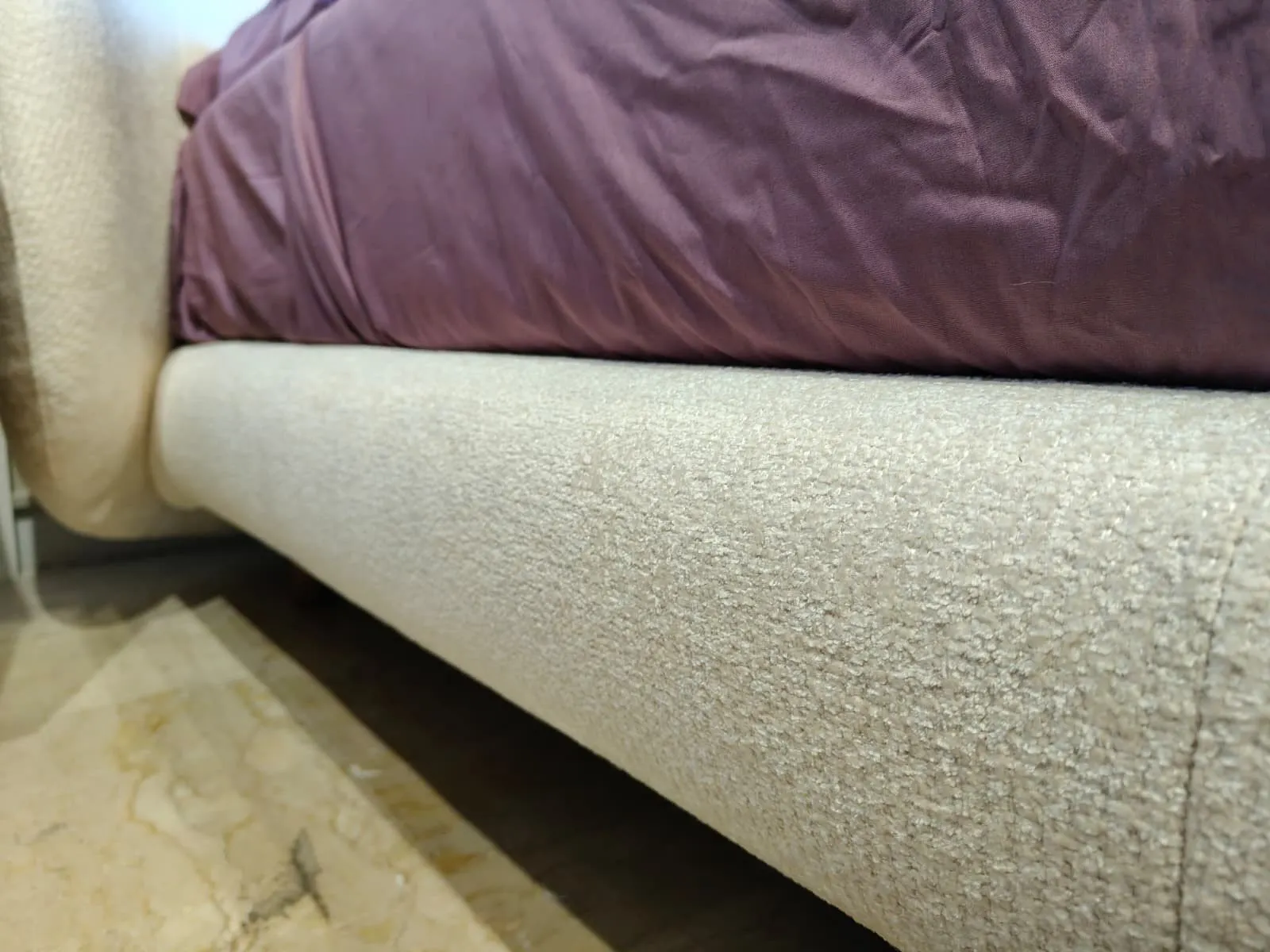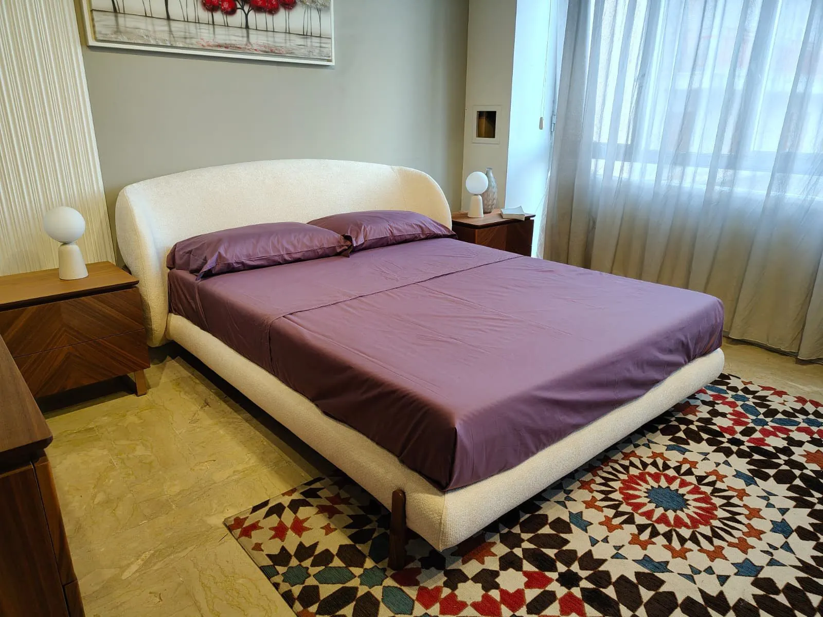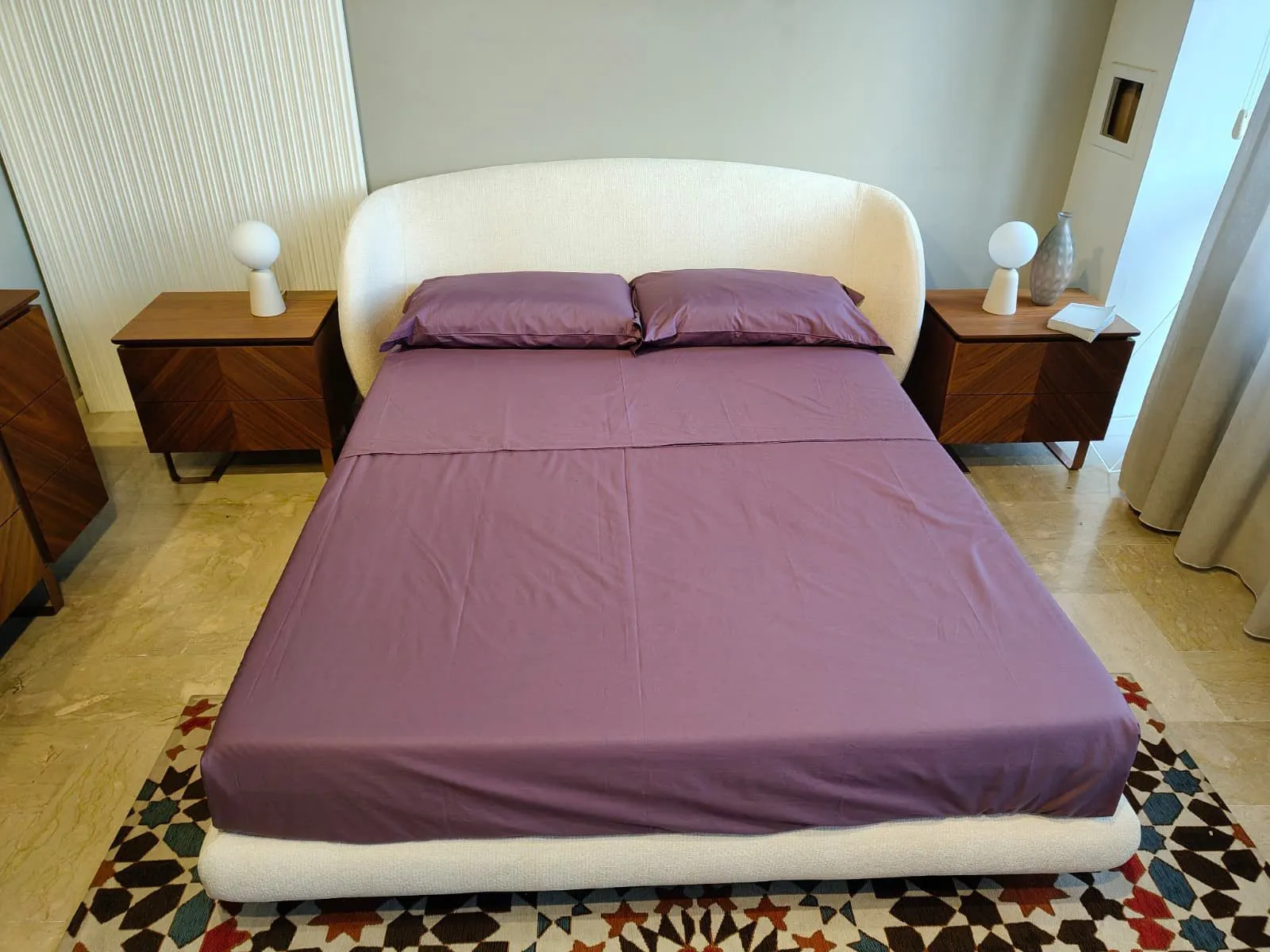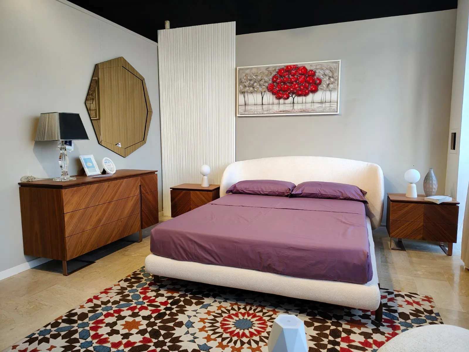 La sua testiera avvolgente è il dettaglio che cattura subito l’attenzione: un morbido schienale imbottito, abbracciato da un elemento orizzontale in legno, che ne sottolinea la forma e ne esalta la morbidezza, creando un equilibrio armonioso tra comfort e design.