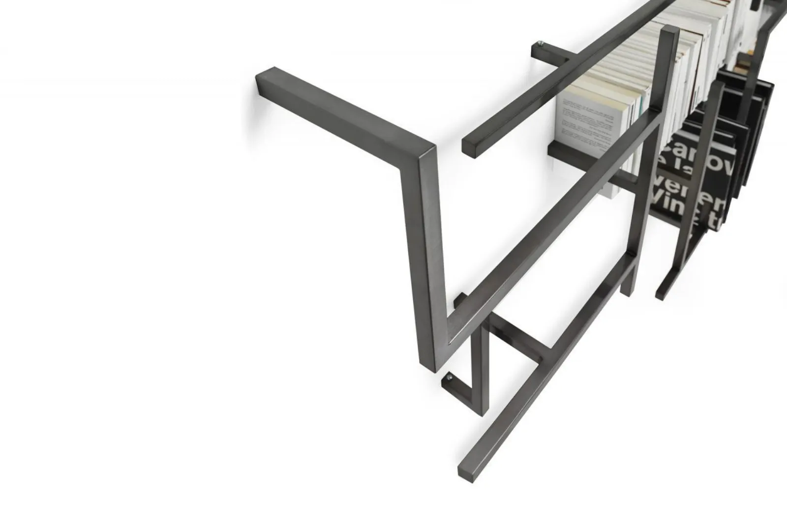 Libreria a parete con struttura tubolare quadrata da cm 2.5x2.5 in metallo finitura piombo lucido oppure verniciata bianco opaco.