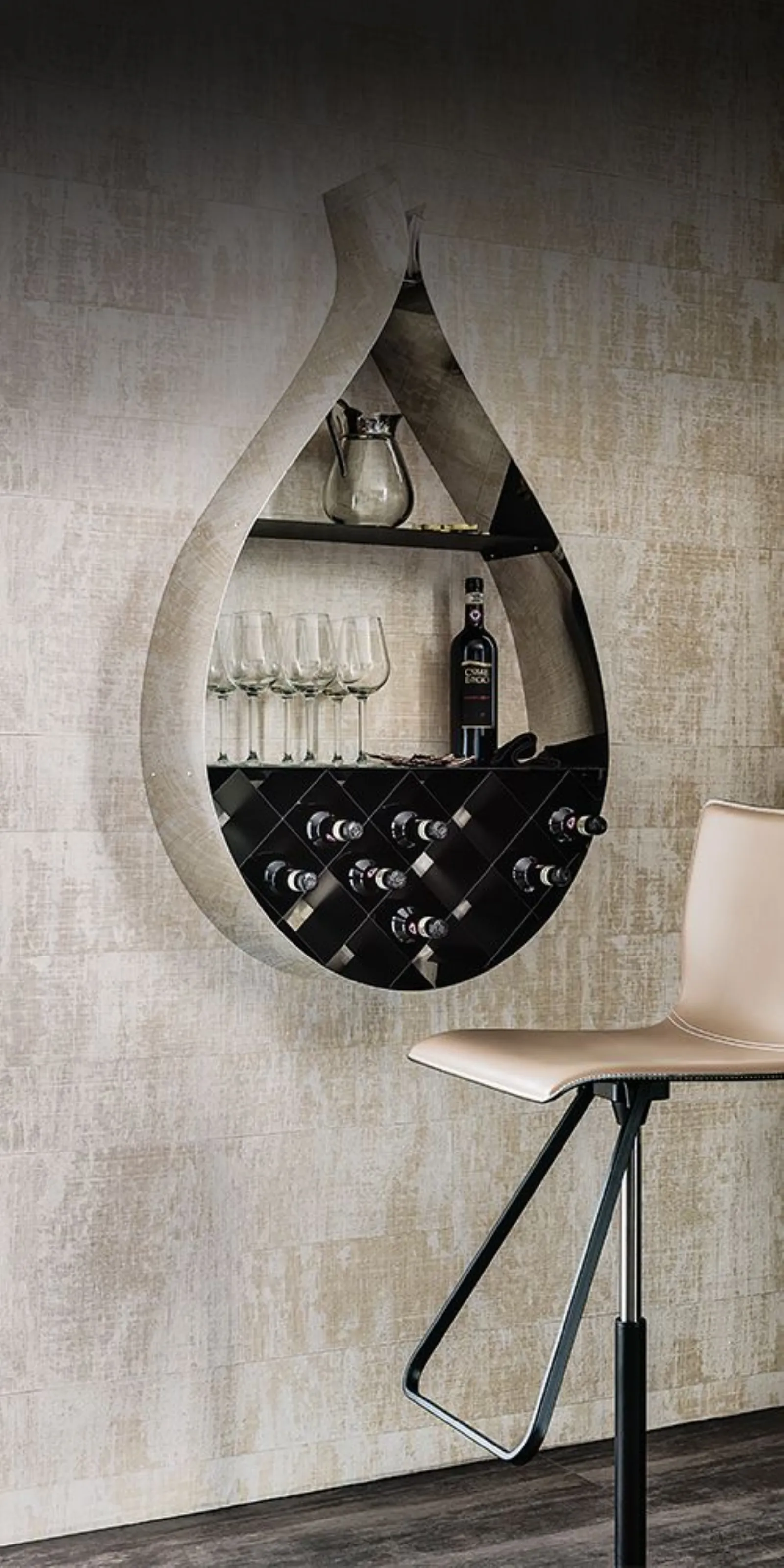 Con una forma a goccia evocativa della sua funzione, questo portabottiglie a muro è un originale complemmento per il proprio living di design.