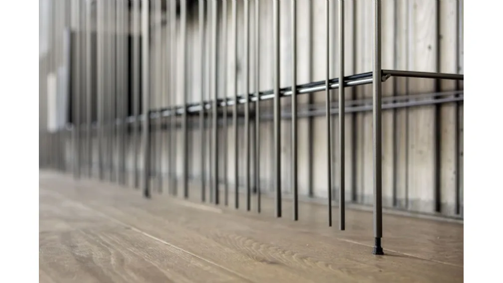 La struttura è semplice, il ritmo è scandito dalle bacchette di ferro fissate a diversi intervalli su una struttura apertamente rigorosa entro la quale i libri e gli oggetti inseriti ne completano la forma scrivendo di volta in volta nuove composizioni.