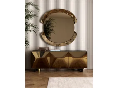 Le ante a specchio della madia Bontempi Eden sono impreziosite da un disegno geometrico, vero fulcro visivo di questa madia moderna, le quali cambiano d'aspetto in base al punto di vista e alla luce che le colpiscono. Da diverse angolazioni, le geometrie rifletteranno la luce in modi unici, dando vita ad effetti di movimento e profondità. Con luce diretta, il metallo brillerà intensamente, esaltando i contrasti, mentre una luce diffusa ammorbidirà i contorni di questa madia design. Quando la fonte luminosa proverrà lateralmente, emergeranno ombre e gradienti che accentuano la tridimensionalità del disegno geometrico posto sulle ante della madia Eden Bontempi. La madia Bontempi Eden è a tutti gli effetti un elemento dinamico e interattivo che si adatta alla luce e al punto di vista dell’osservatore nell'ambiente, l'obbiettivo che si sono posti i designer è generare un continuo gioco di luci e ombre. Potrai divertirti con gli effetti luminosi posizionando una lampada da tavolo al di sopra della madia moderna, collocando una lampada da terra nelle sue vicinanze oppure, per un effetto ancor più stiloso, installando una lampada a sospensione che da soffitto possa scendere asimmetricamente sopra la madia Eden Bontempi.