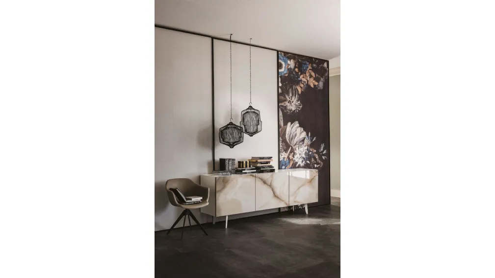 Questa credenza moderna mette in risalto il rivestimento delle ante in preziosa ceramica Marmi disponibile in numerose nuance raffinate.