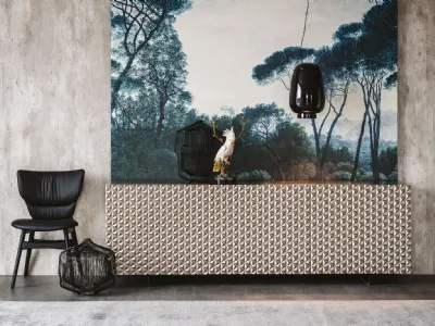 La madia moderna Royalton è formata da una composizione di volumi tridimensionali che formano un pattern geometrico in grado di ammaliare ed ipnotizzare. Questa decorazione è presente sulle ante in poliuretano verniciato, che creano un effetto chiaro scuro affascinante.