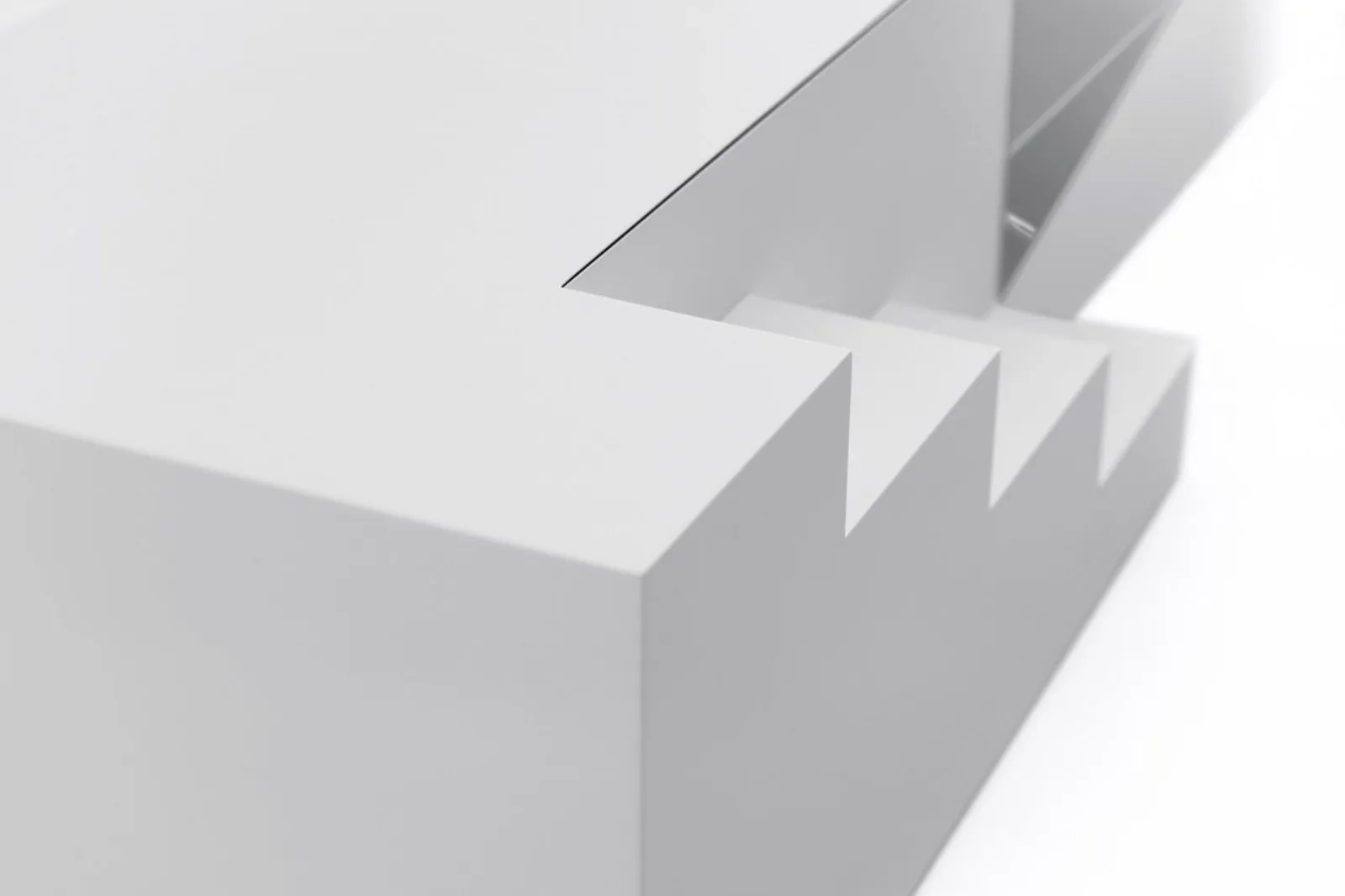 Il mobile porta tv Mezzanino di Mogg, è un mobile-tavolino mutlifunzione dal design monolitico e scultoreo estremamente semplice e lineare, ma con l'aggiunta di un elemento che rompe l'austerità e la rigidezza dell'oggetto; una serie di gradini che portano la mente al mondo dell'architettura, ricordano le scalinate segli edifici,dei monumenti, e i gradini degli ingressi delle case che conducono alla porta.