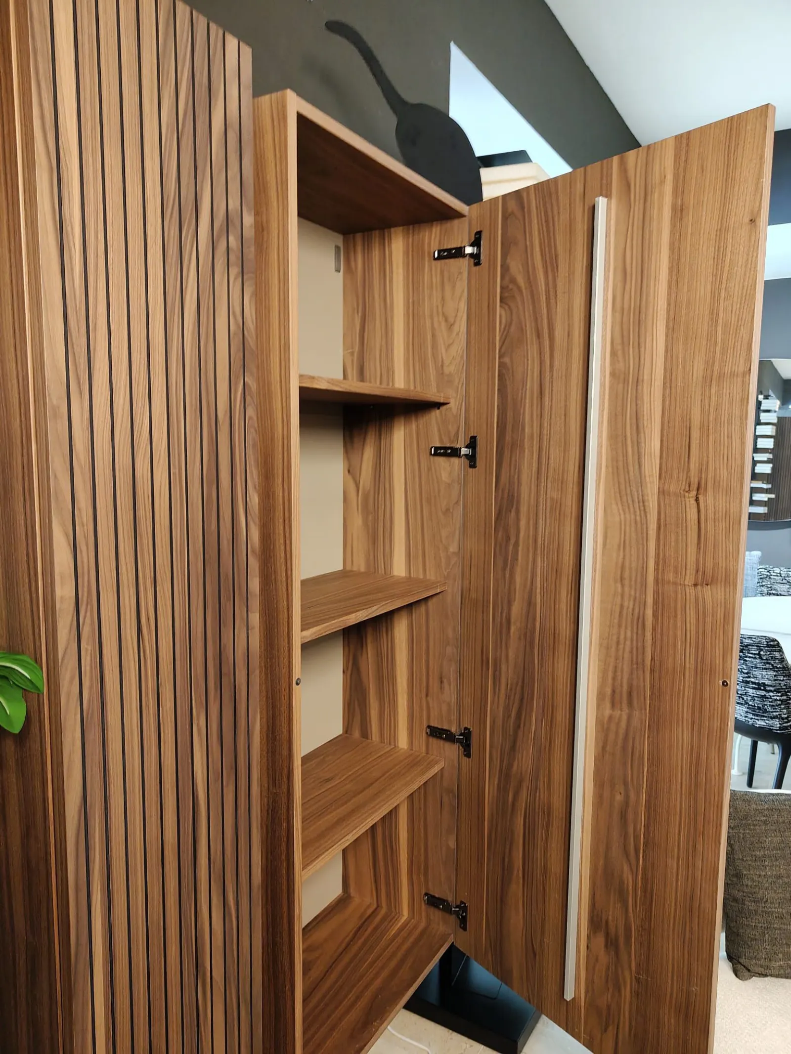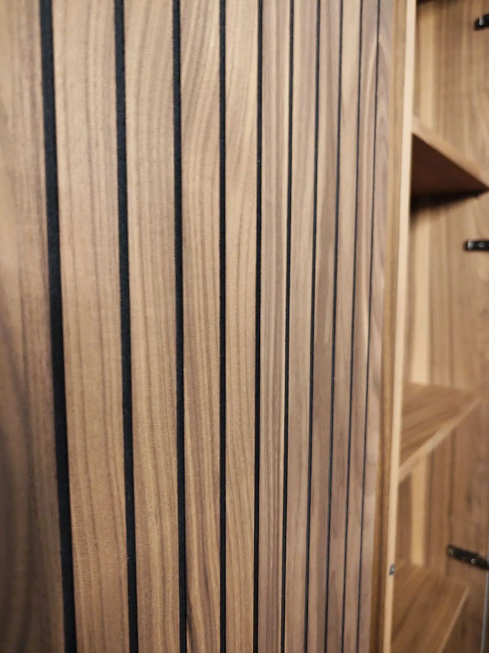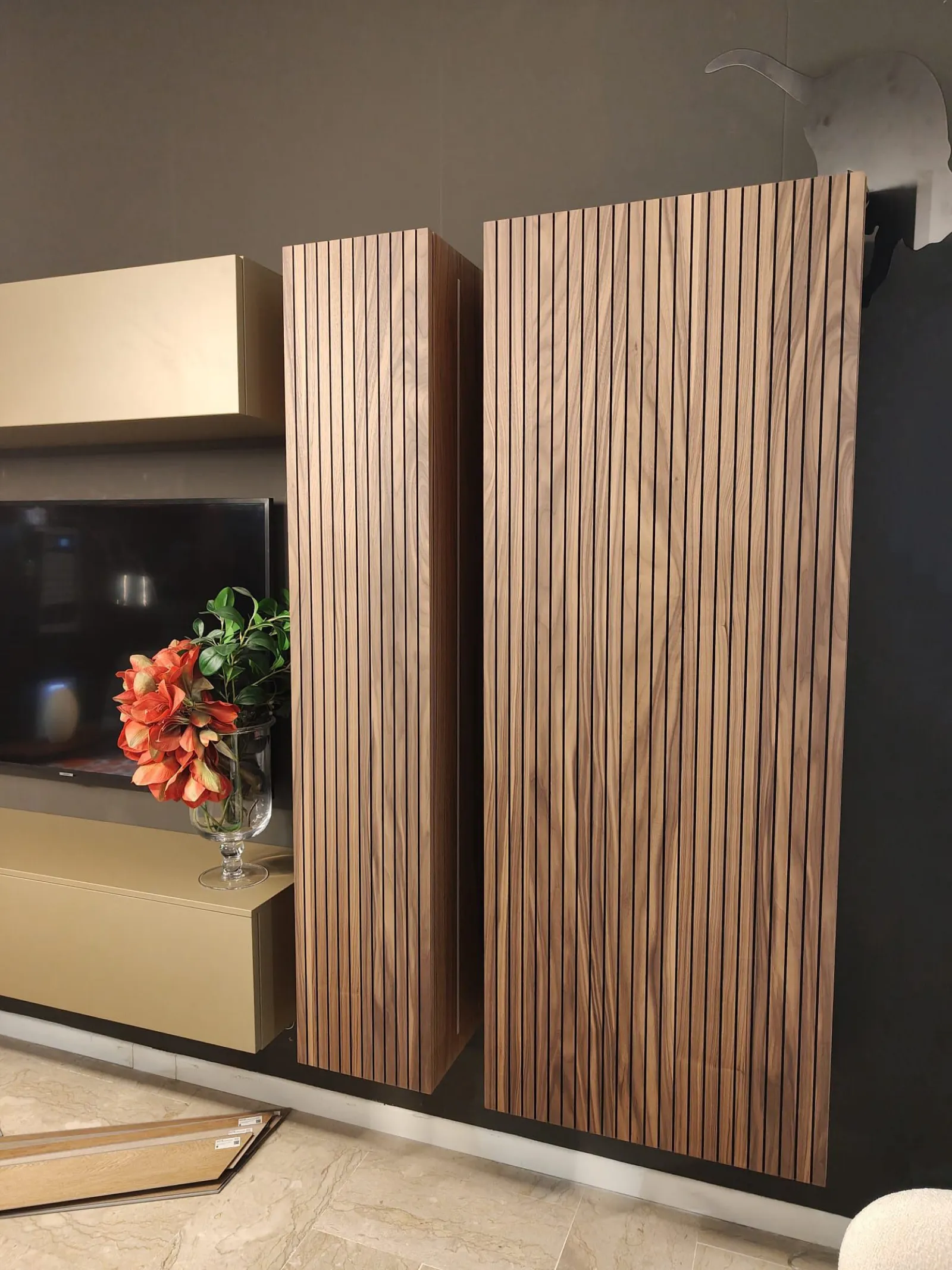 A interrompere la linearità, due colonne verticali in essenza legno introducono calore e movimento grazie alla loro texture rigata, creando un contrasto elegante con il fondo scuro della parete.