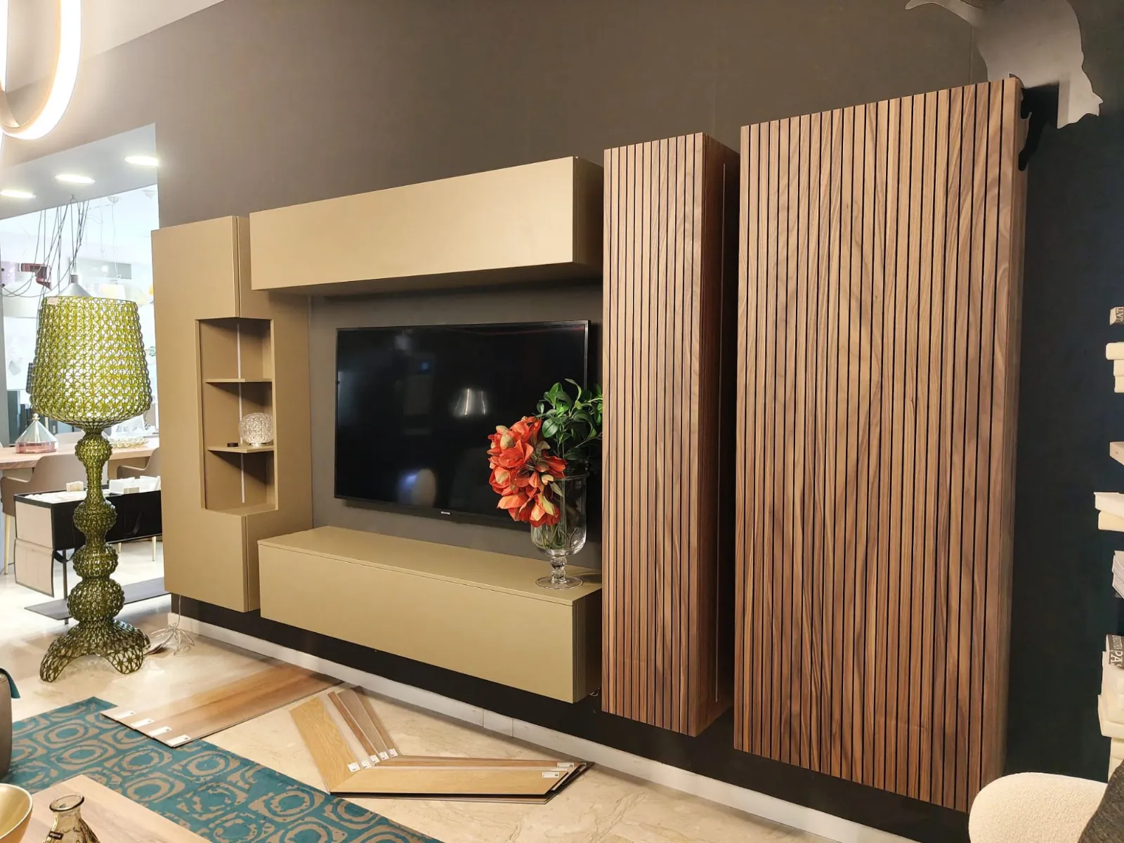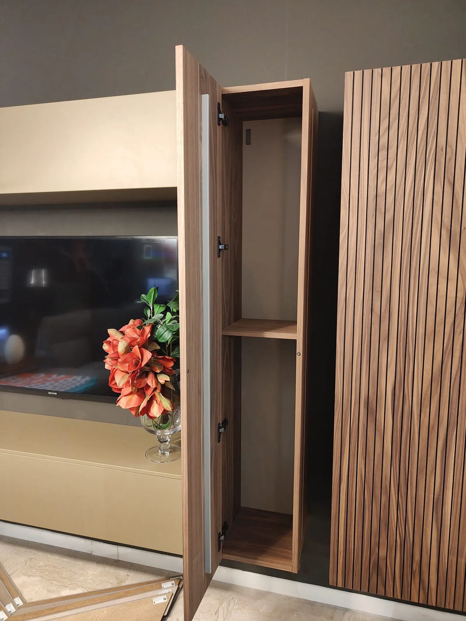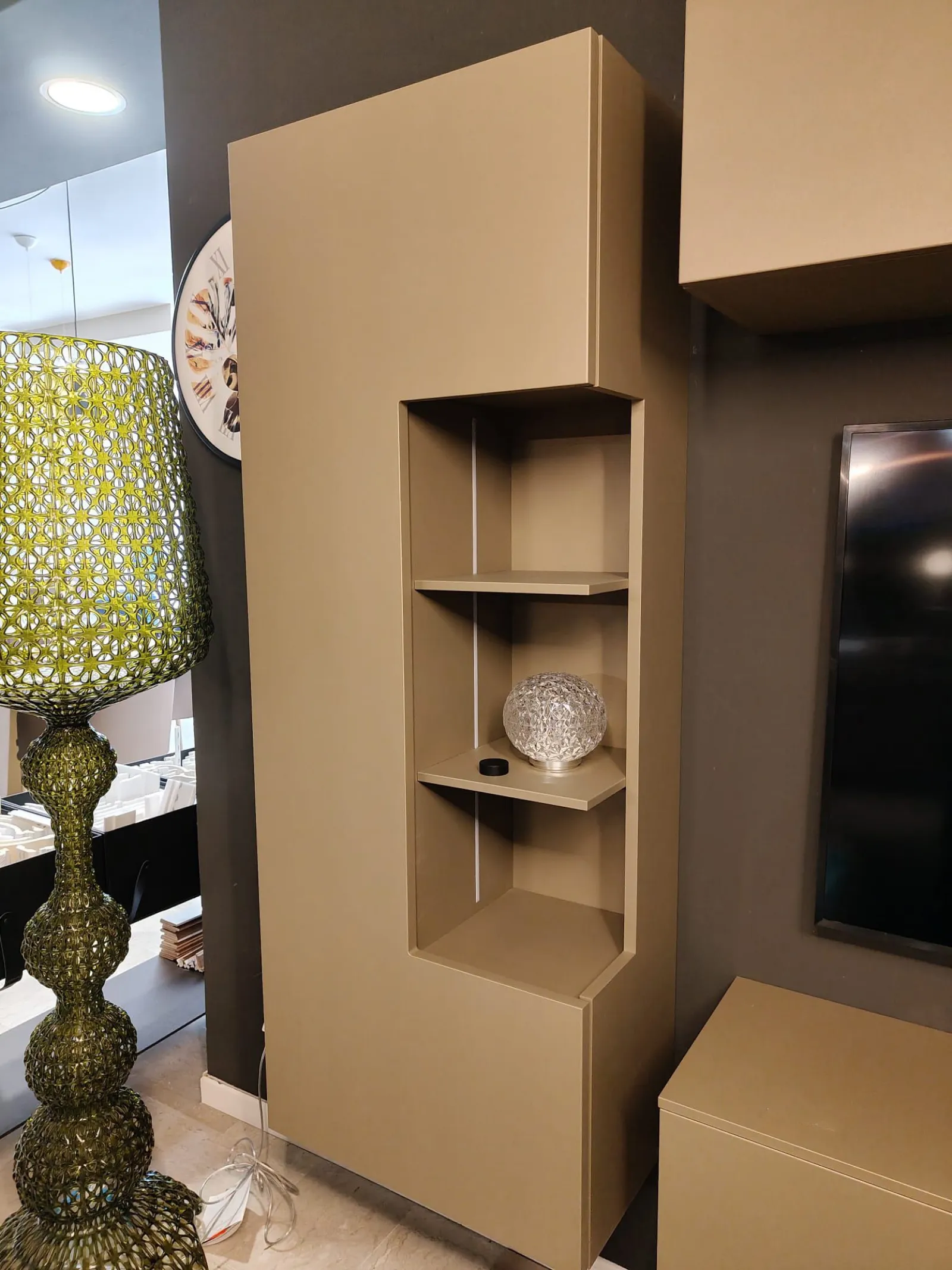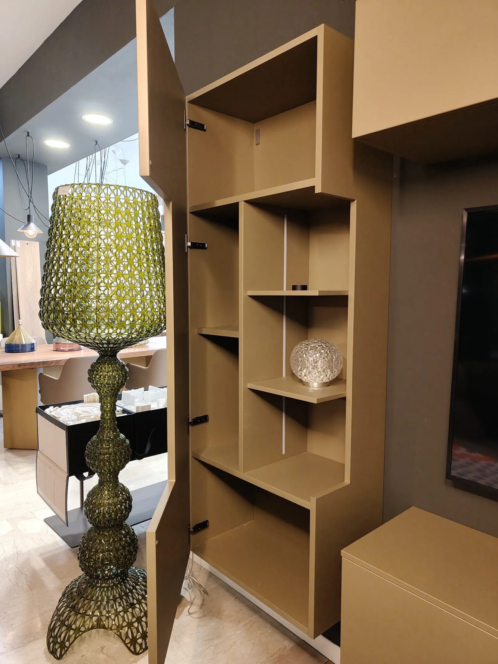 Sul lato opposto, un modulo con vani a giorno aggiunge dinamismo e offre spazio per oggetti decorativi, contribuendo a personalizzare l’insieme.