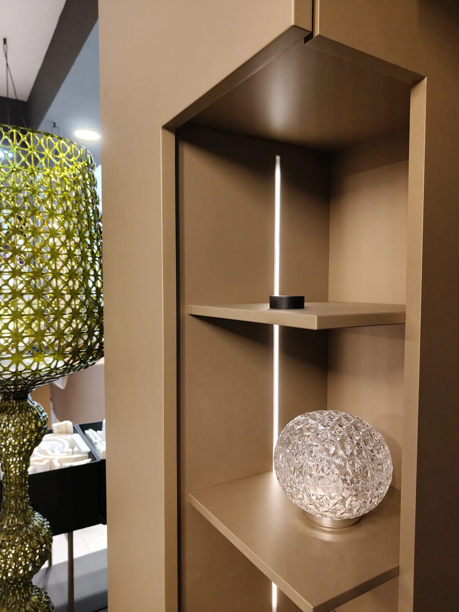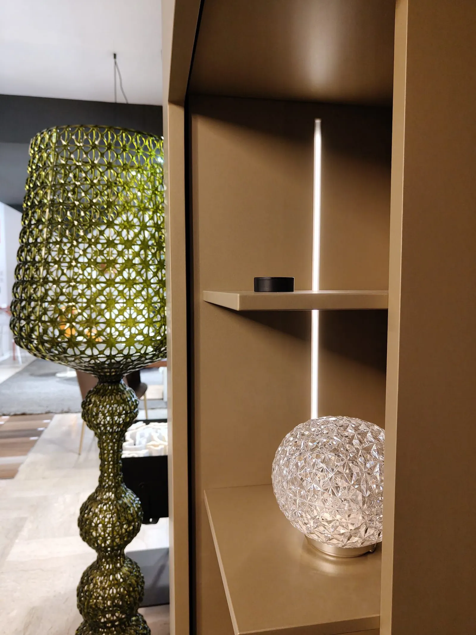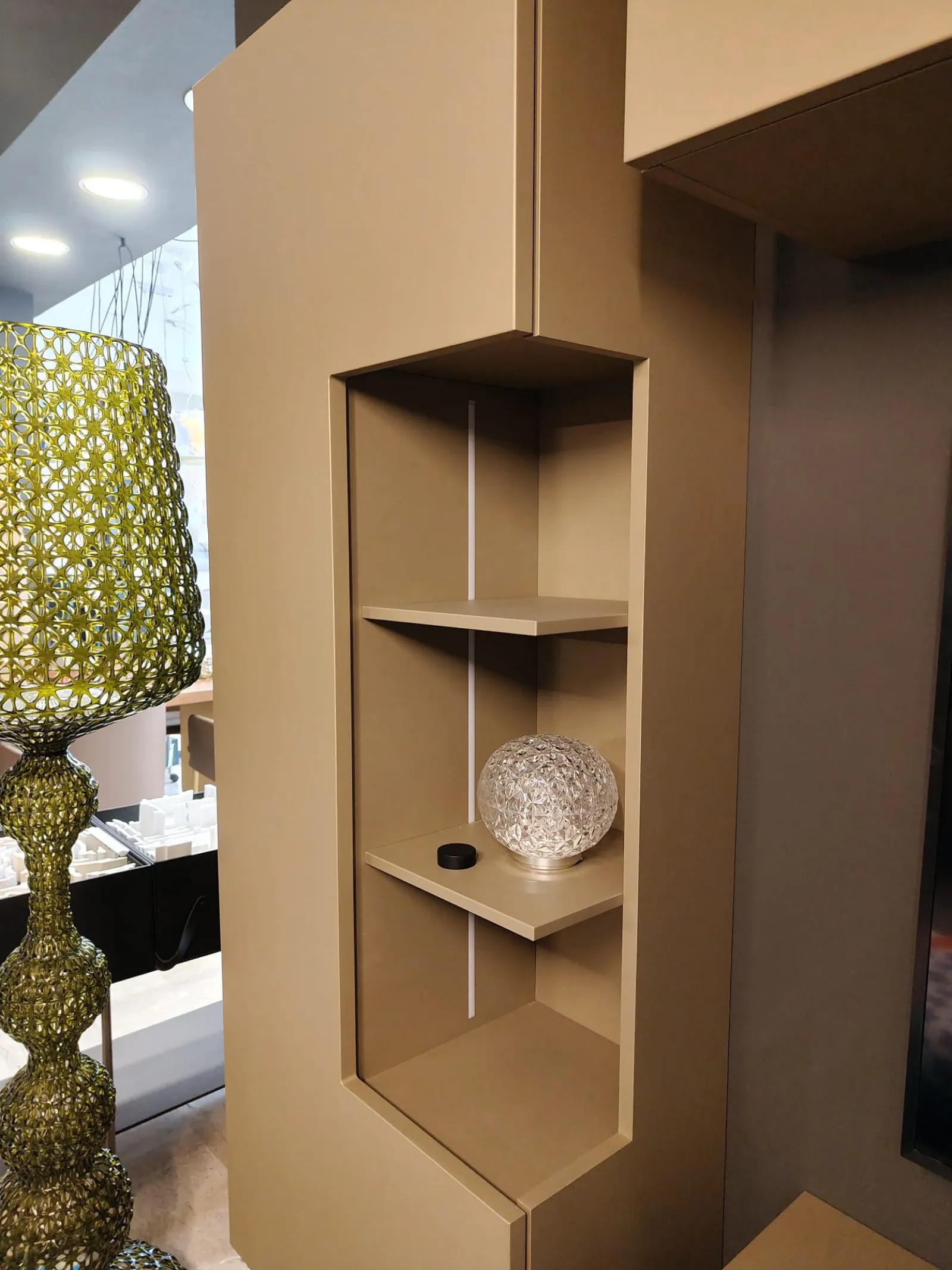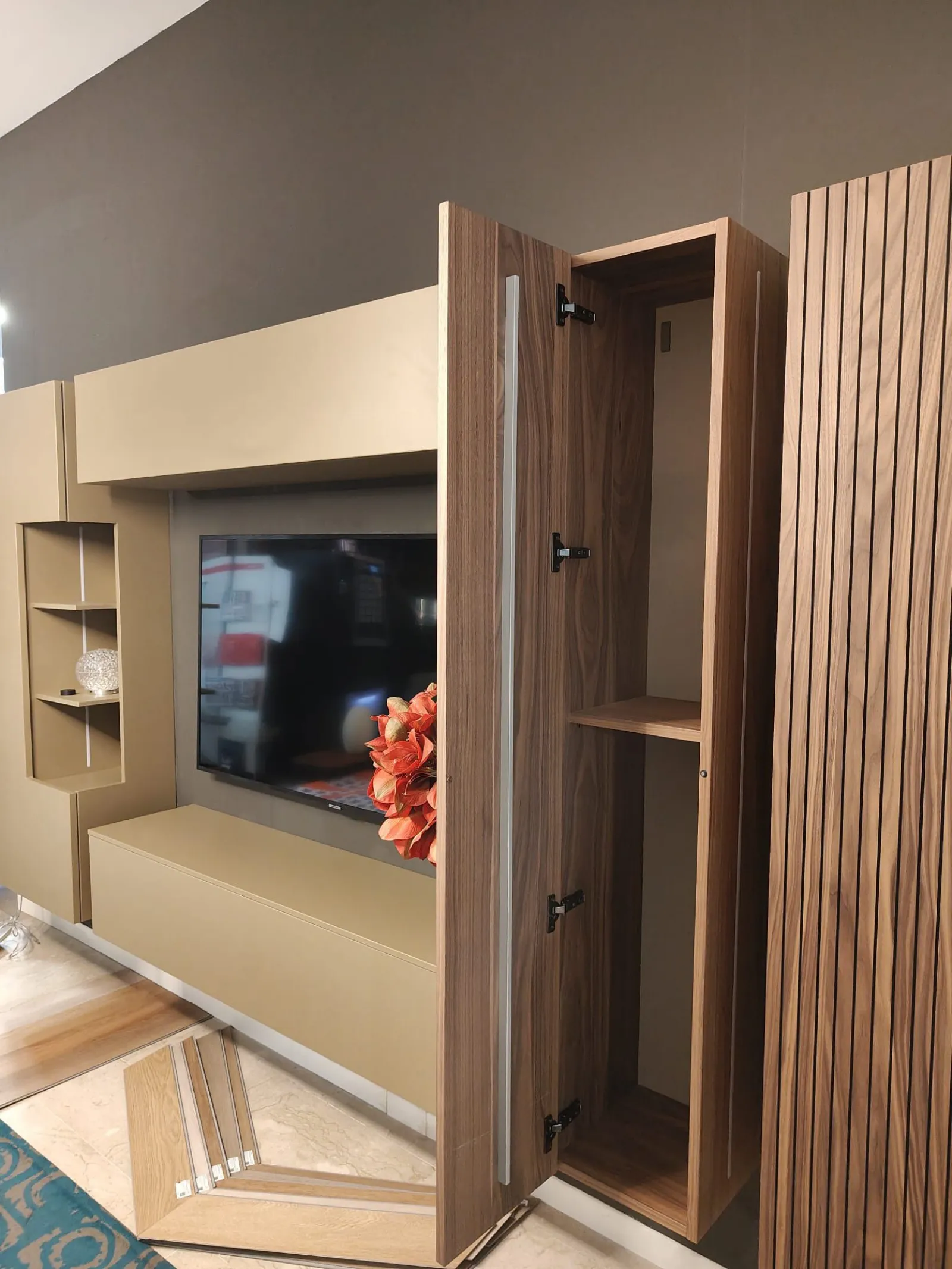 Sul lato opposto, un modulo con vani a giorno aggiunge dinamismo e offre spazio per oggetti decorativi, contribuendo a personalizzare l’insieme.
