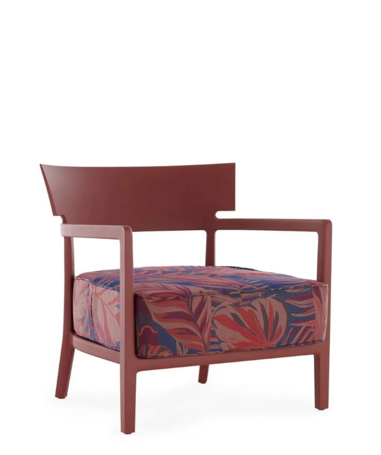 La poltrona Cara di Philippe Starck si presentano con una nuova veste, grazie all'utilizzo dei tessuti Liberty appositamente progettati per gli spazi all'aperto.