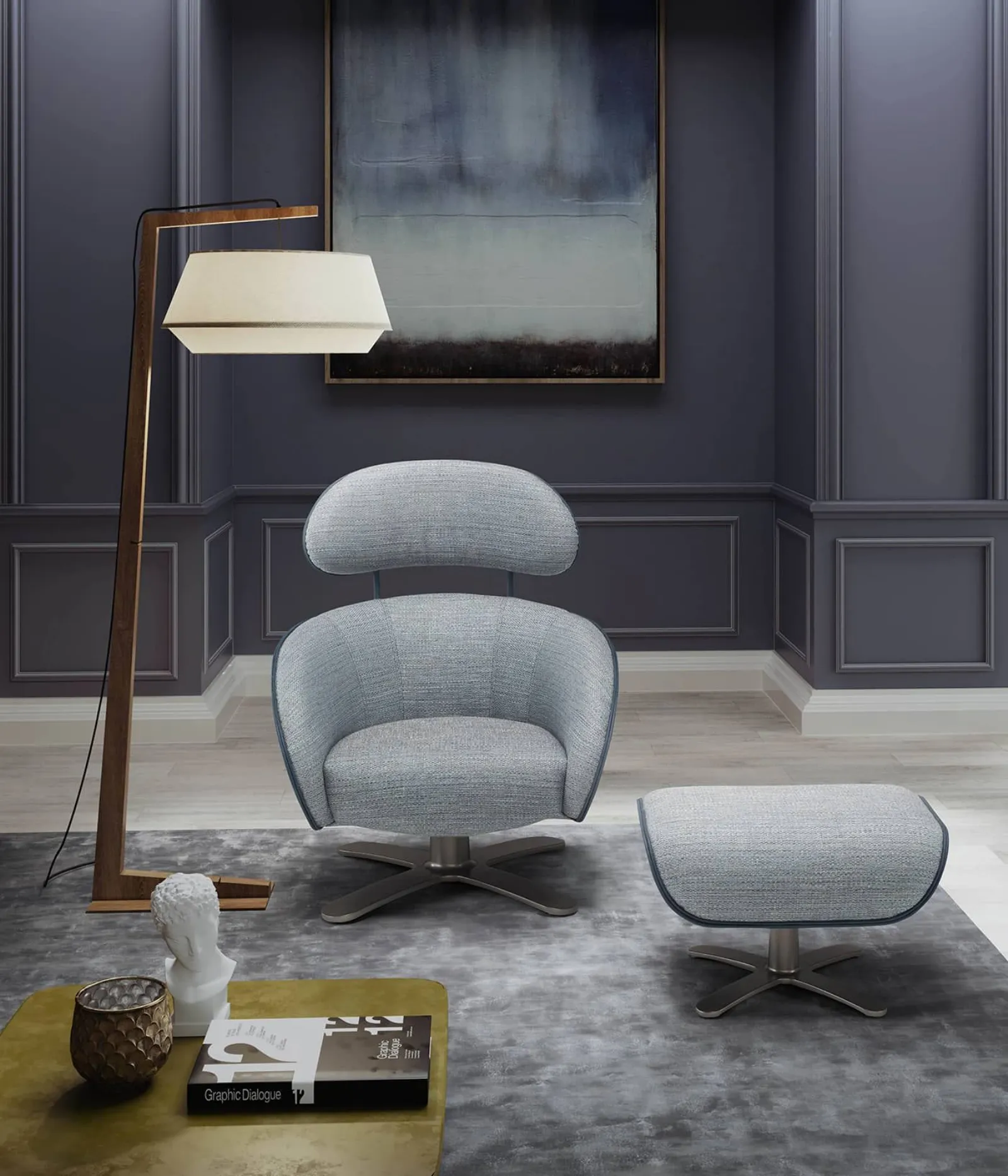 La scocca esterna degli elementi è infatti realizzata in cellulosa riciclata, un materiale rigido che definisce il profilo della poltrona e del pouf e ricorda il guscio di una noce di cocco. L’intelaiatura racchiude le linee morbide e ampie degli imbottiti, morbidi e accoglienti, realizzati in poliuretano espanso e ricoperti da una fibra autoestinguente. Entrambi gli arredi poggiano su una base in alluminio, verniciata in una colorazione esclusiva.