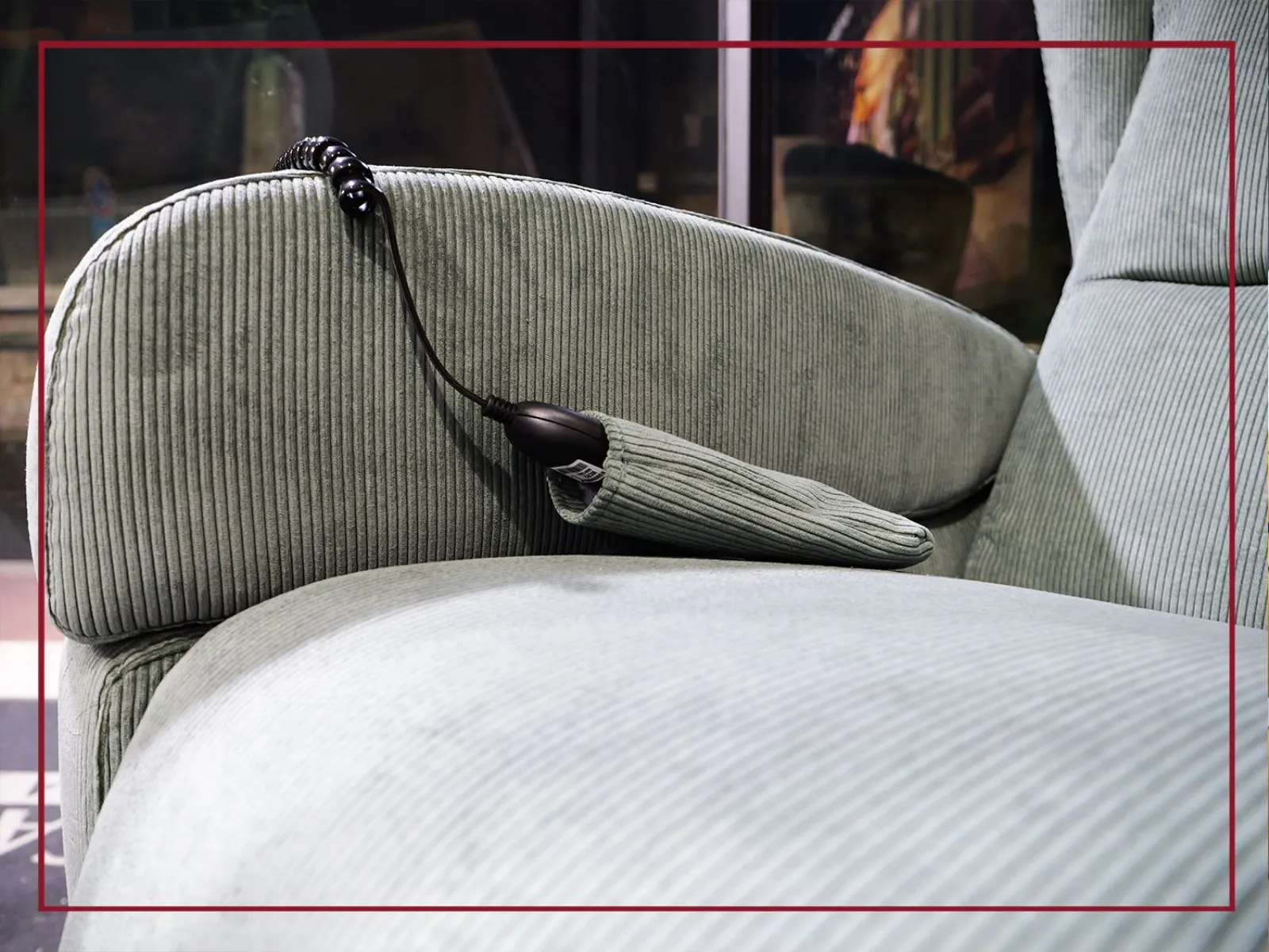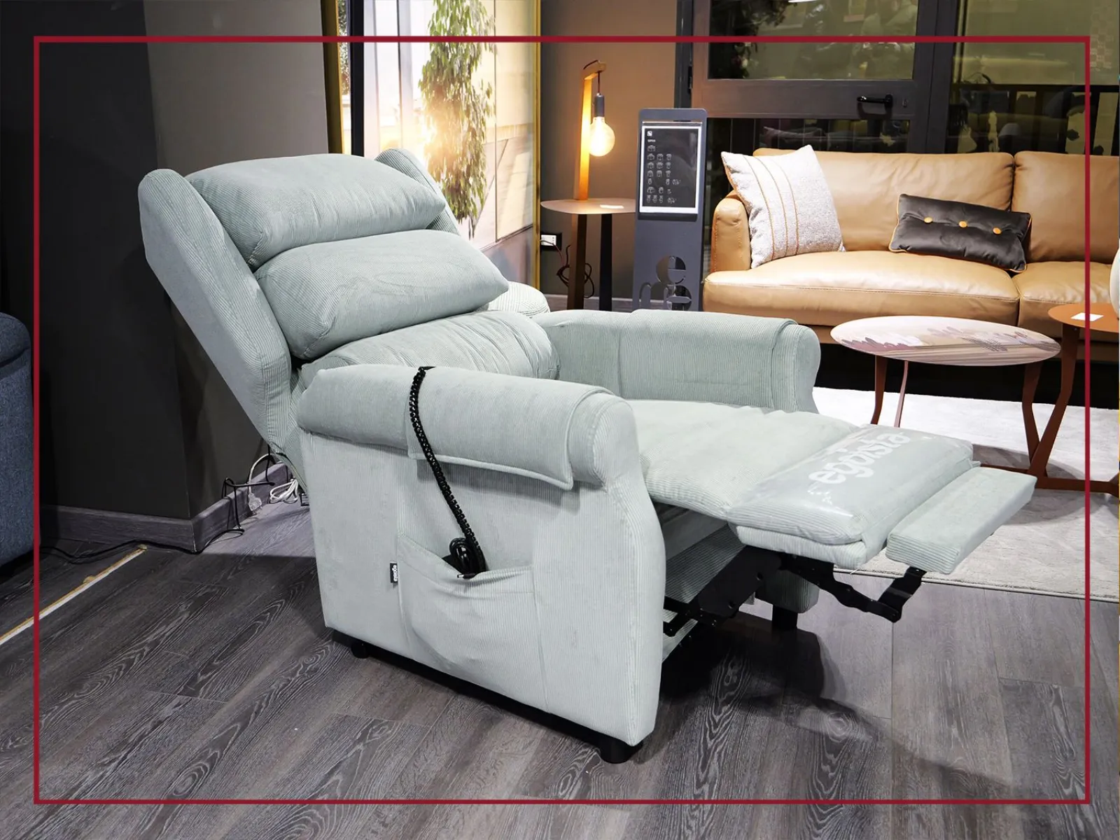 Poltrona Lift-Relax realizzata con meccanismo motorizzato. La struttura solida è assemblata con parti esterne e interne in agglomerato di legno (multistrato e massello di legno) ricoperta da poliuretano espanso indeformabile