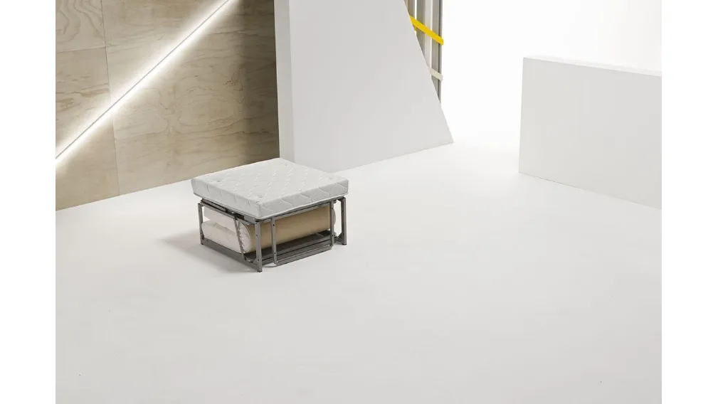 MECCANISMO: pratico meccanismo trasformabile da pouf in letto, l’apertura della seduta si ottiene per sollevamento e consente il passaggio alla posizione letto con un semplice movimento del telaio alloggiato sotto la seduta. Il piano dormita è realizzato in maglie elettrosaldate e dispone di un materasso h.12 cm.