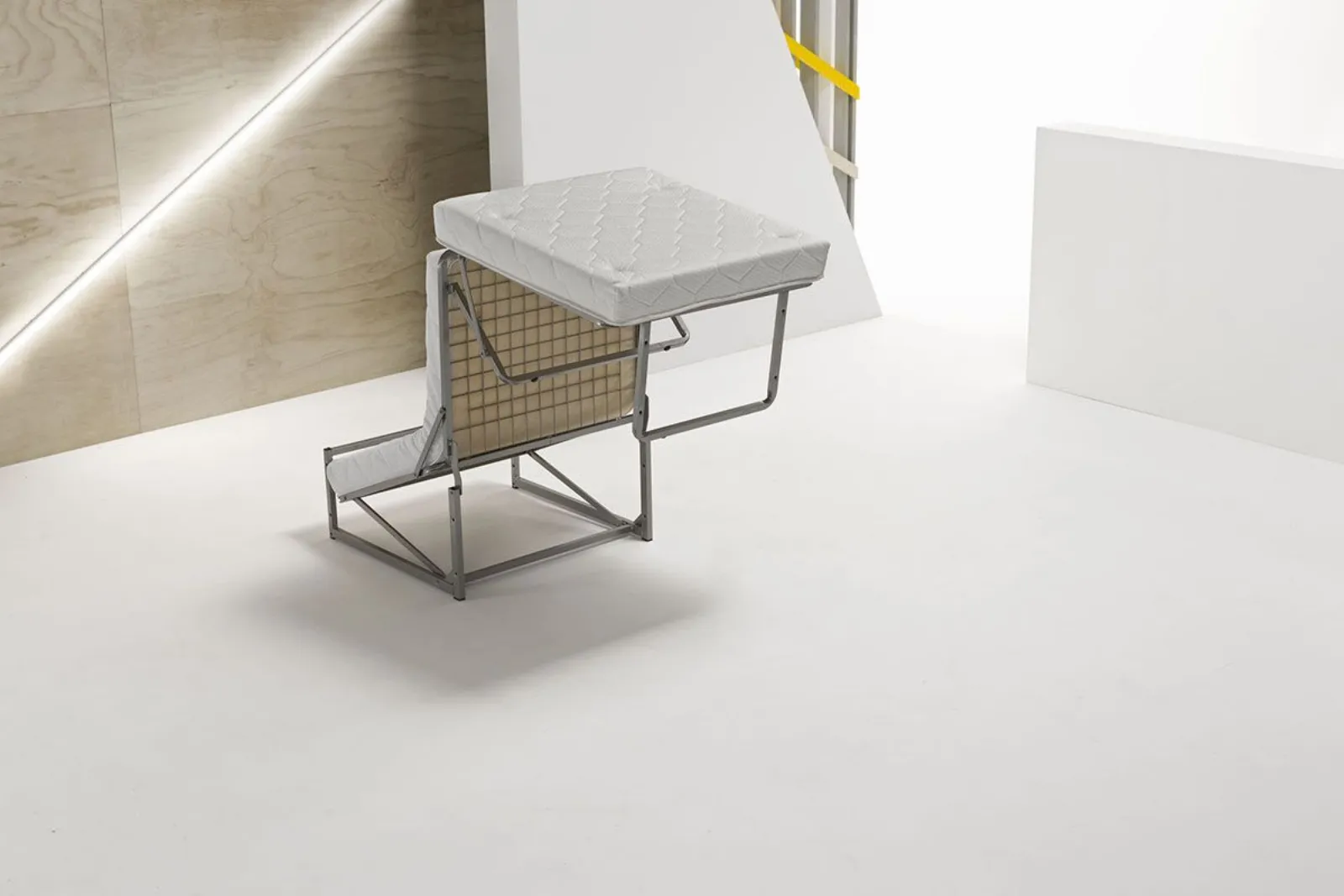 MECCANISMO: pratico meccanismo trasformabile da pouf in letto, l’apertura della seduta si ottiene per sollevamento e consente il passaggio alla posizione letto con un semplice movimento del telaio alloggiato sotto la seduta. Il piano dormita è realizzato in maglie elettrosaldate e dispone di un materasso h.12 cm.