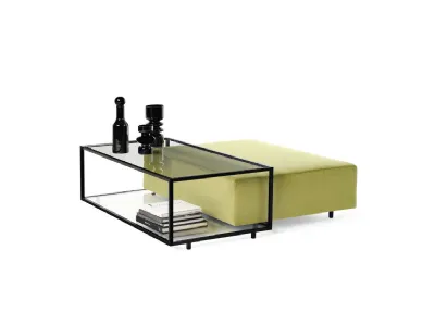 Zoom pouf è imbottito sfoderabile completo di tavolino con struttura in metallo disponibile nelle finiture bronzo patinato oppure verniciata nero, e piano in vetro trasparente.
