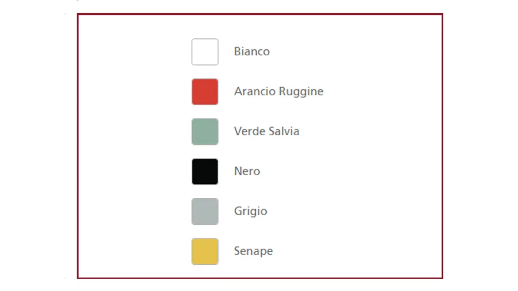 SENAPE, BIANCO, ARANCIO RUGGINE, SALVIA, NERO,GRIGIO