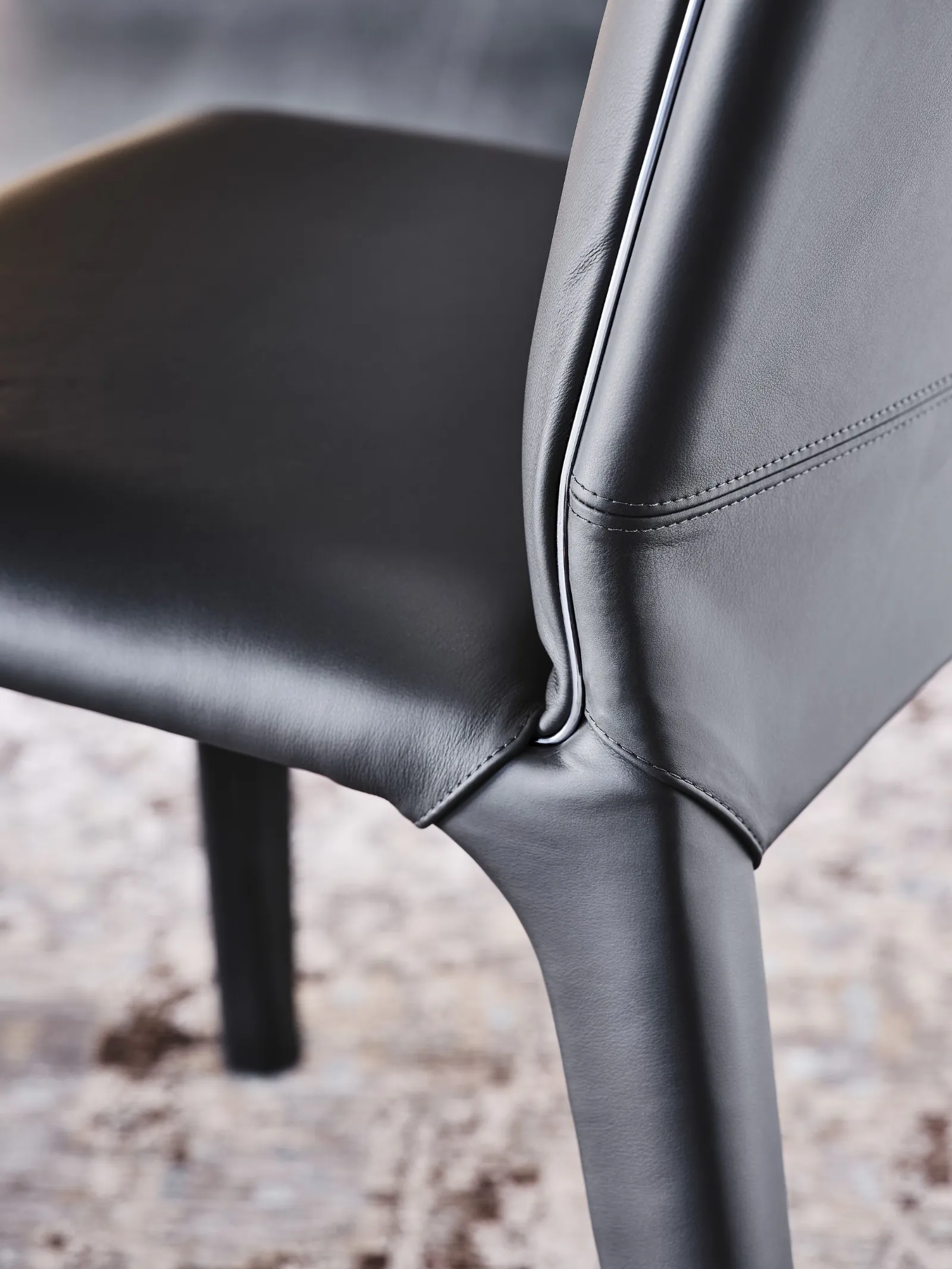 Il rivestimento integrale in tessuto, ecopelle o pelle è disponibile in numerose tonalità con delicate cuciture in tinta che esaltano le forme della seduta.