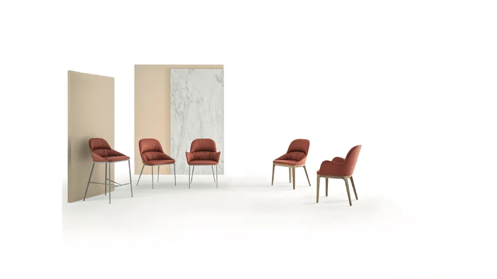 La struttura può essere in legno massello o acciaio laccato, mentre la scocca è imbottita e rivestita in una vasta gamma di materiali.