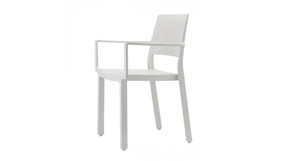 Aspetto sobrio, linee essenziali, comodità, la struttura interamente in tecnopolimero e i fori la rendono ideale per gli spazi outdoor, sia domestici che contract; la particolare forma delle gambe realizza una soluzione tecnica unica che ne consente l’impilaggio perfetto senza lasciare fughe, eccezionalmente stabile. Disponibile con e senza braccioli, in diversi colori.