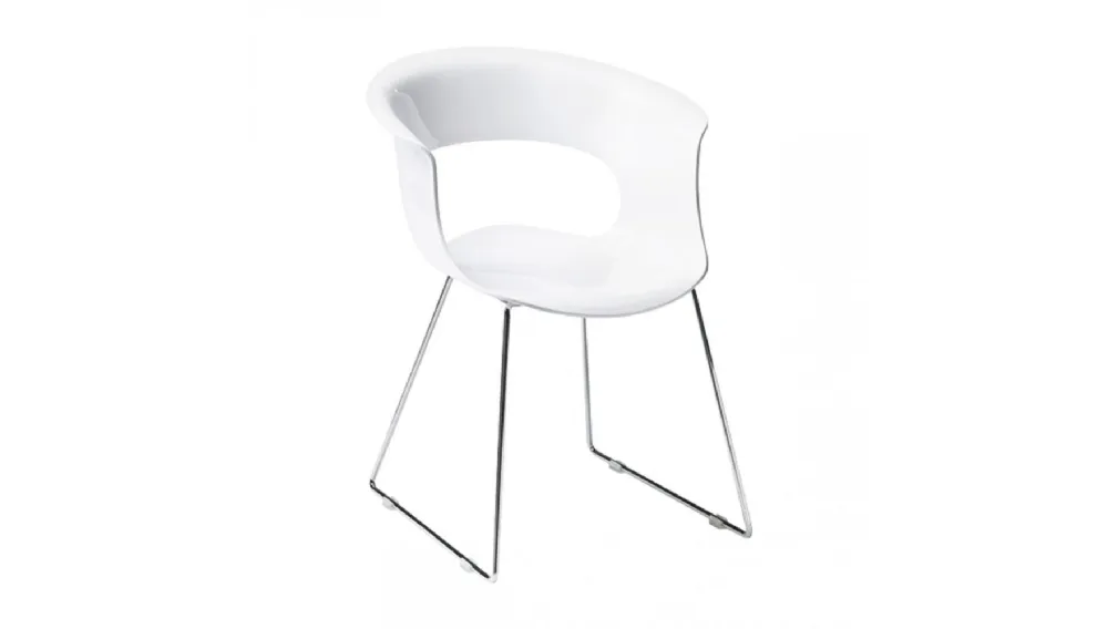 Questa poltroncina moderna con base a slitta presenta una struttura in acciaio tubolare con sezione di diametro 16 mm. La scocca comoda ed avvolgente è realizzata in policarbonato disponibile in due finiture: trasparente e bianco pieno.Grazie alla sua flessibilità può essere impiegata in cucina o in sala da pranzo, ma allo stesso modo si presta egregiamente ad arredare spazi contract di design.