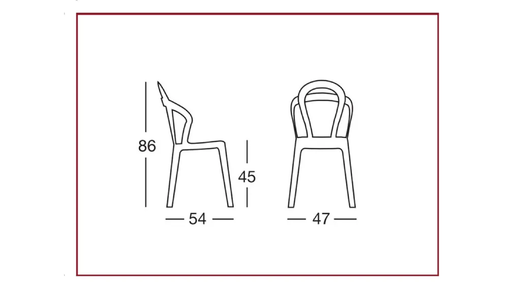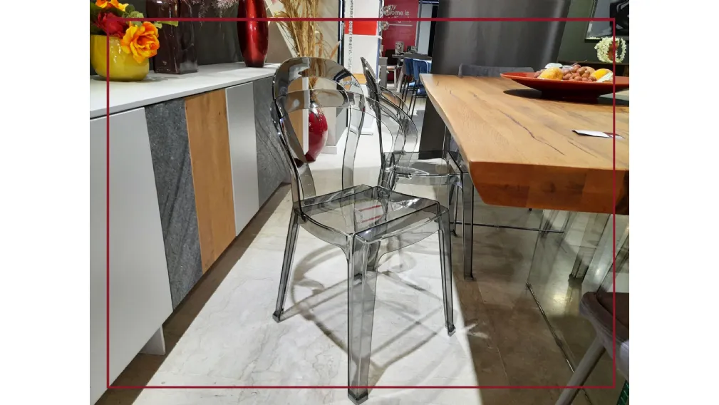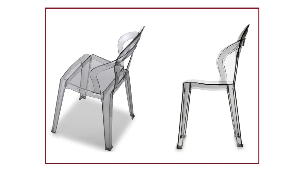Struttura in policarbonato riciclabile trasparente o trasparente colorato. È caratterizzata da uno schienale di sapore Neoliberty, costituito da due parabole che si sovrappongono con naturalezza. Leggera e luminosa, si adatta ad ogni ambiente compresi piccoli spazi ed esterni. Per uso interno/esterno.