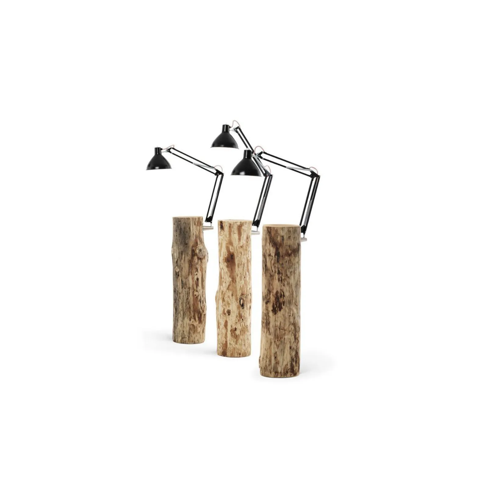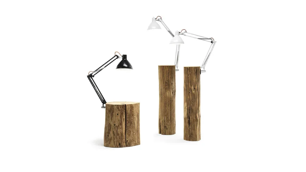 Piantama è un binomio riuscito tra un elemento naturale, il tronco, e l’icona della lampada industriale in metallo