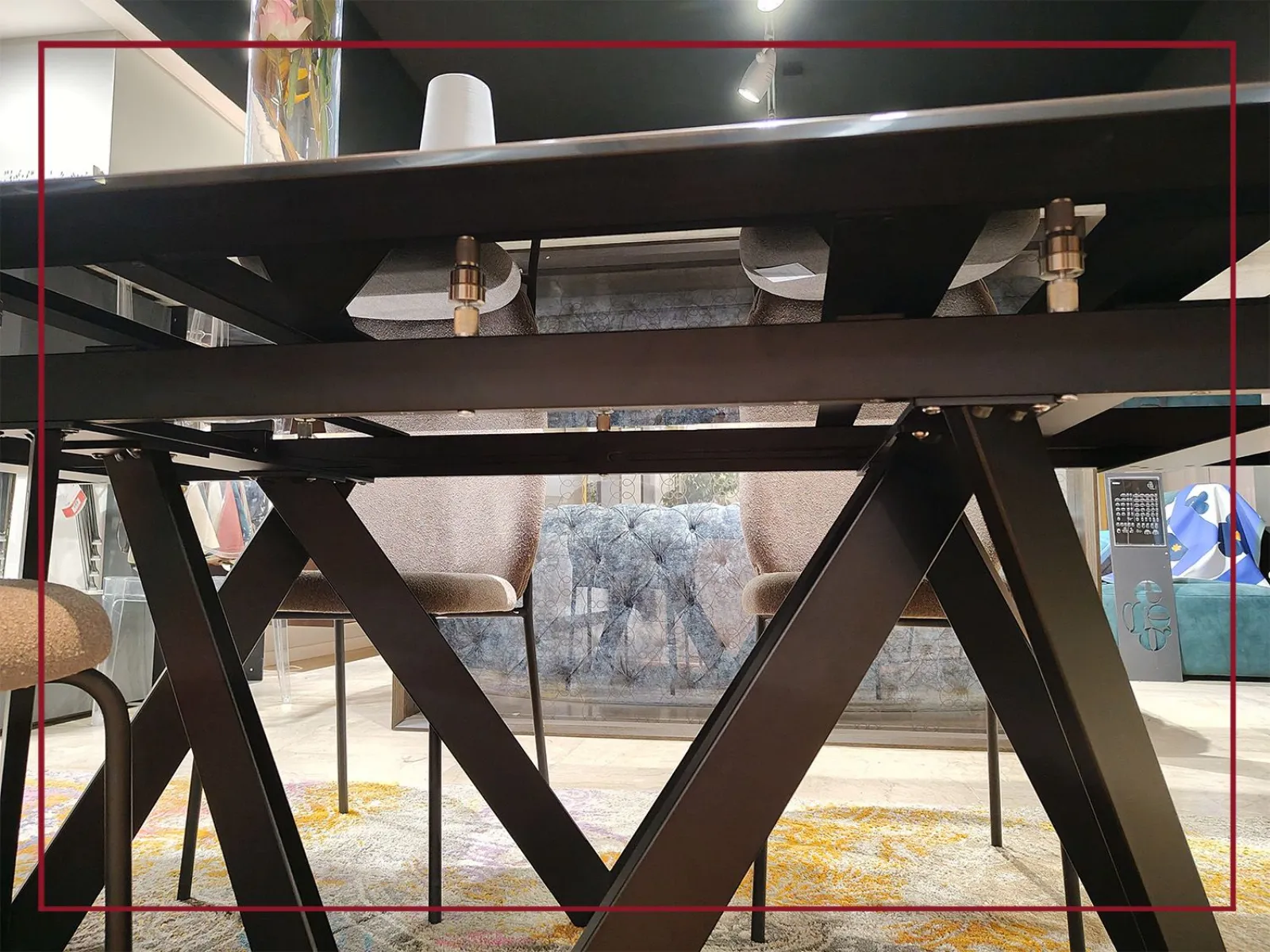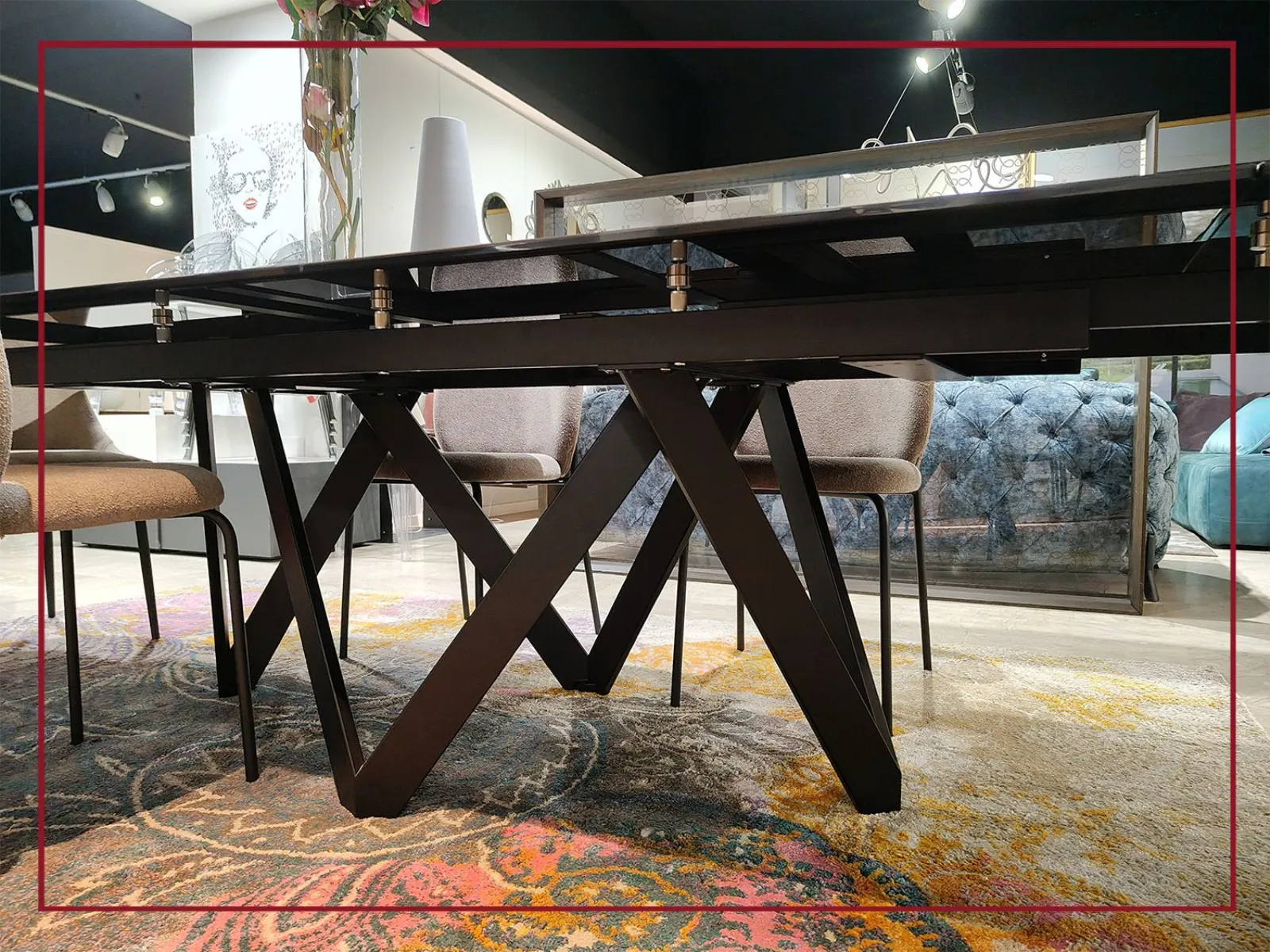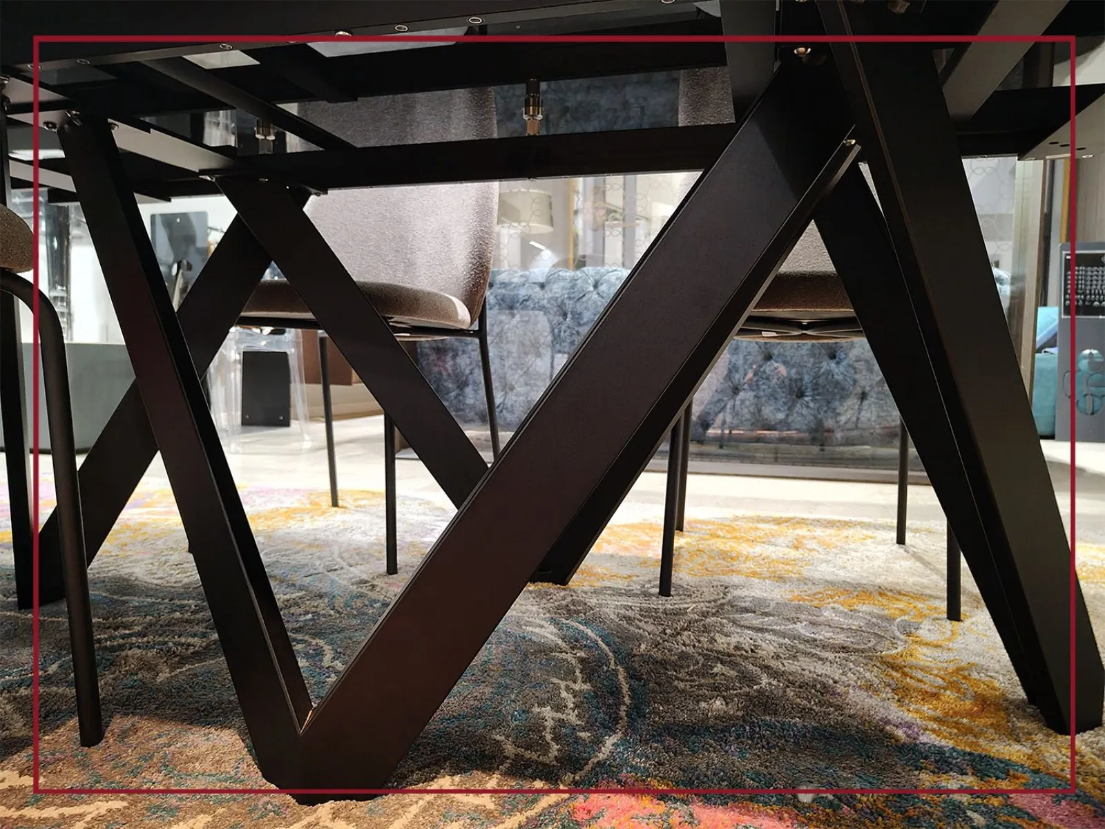 La sua struttura si distingue per una base geometrica composta da quattro elementi in metallo verniciato che si incrociano in modo dinamico, creando un effetto visivo di grande impatto.