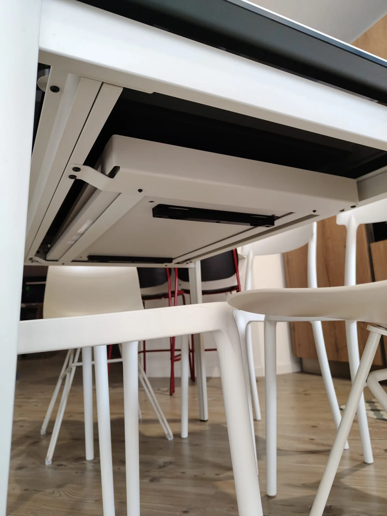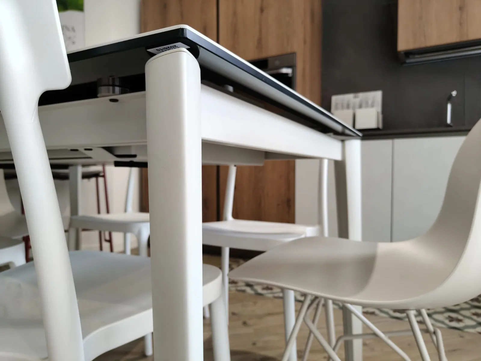 La struttura, solida e ben proporzionata, dialoga con un piano che esprime leggerezza e cura del dettaglio, mentre il meccanismo di allunga — fluido e discreto — permette di ampliare la superficie con un gesto semplice, mantenendo sempre un’estetica pulita.