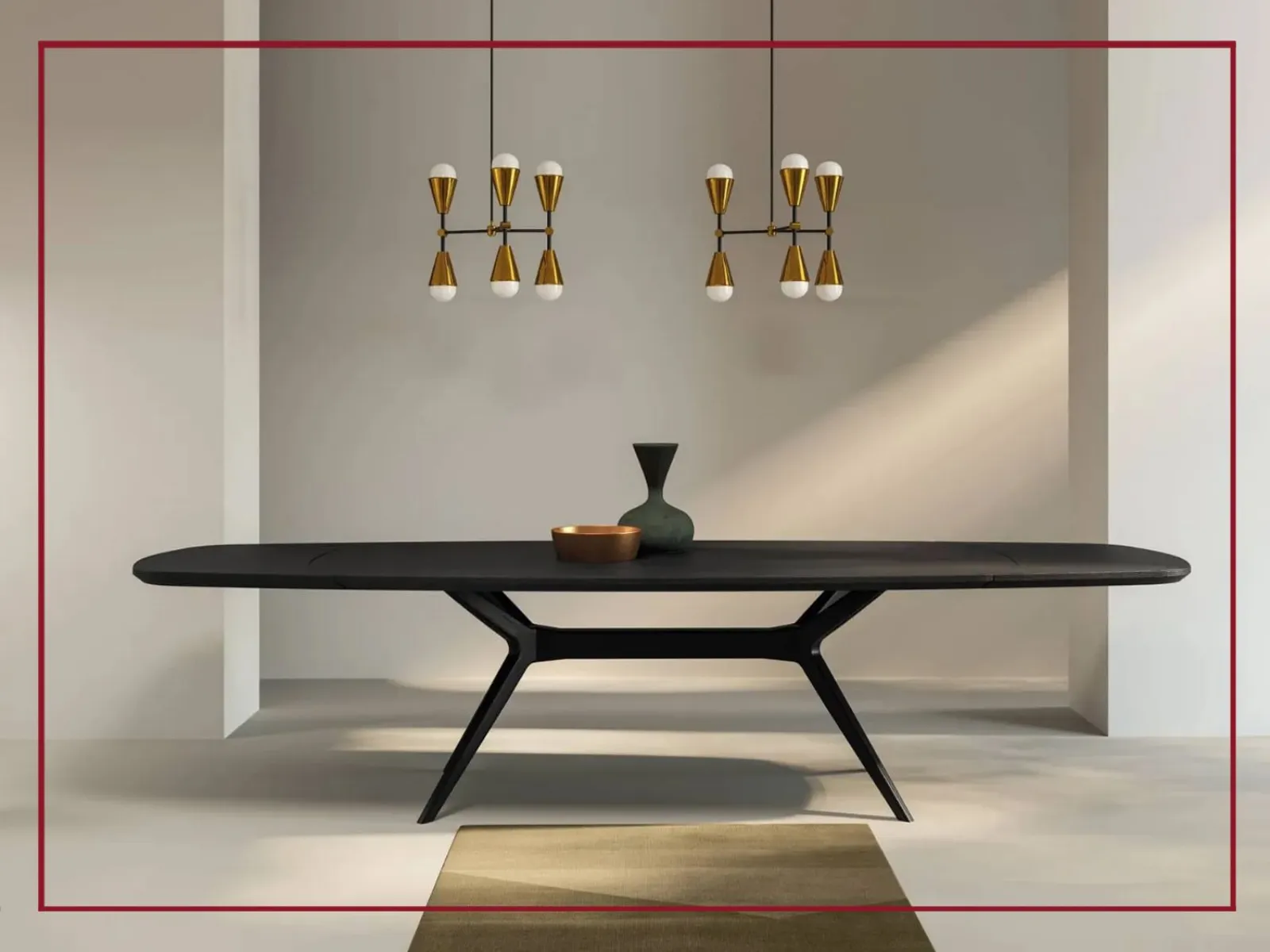 Tavolo rettangolare a “botte” con doppio basamento incrociato in rovere,dal design unico.