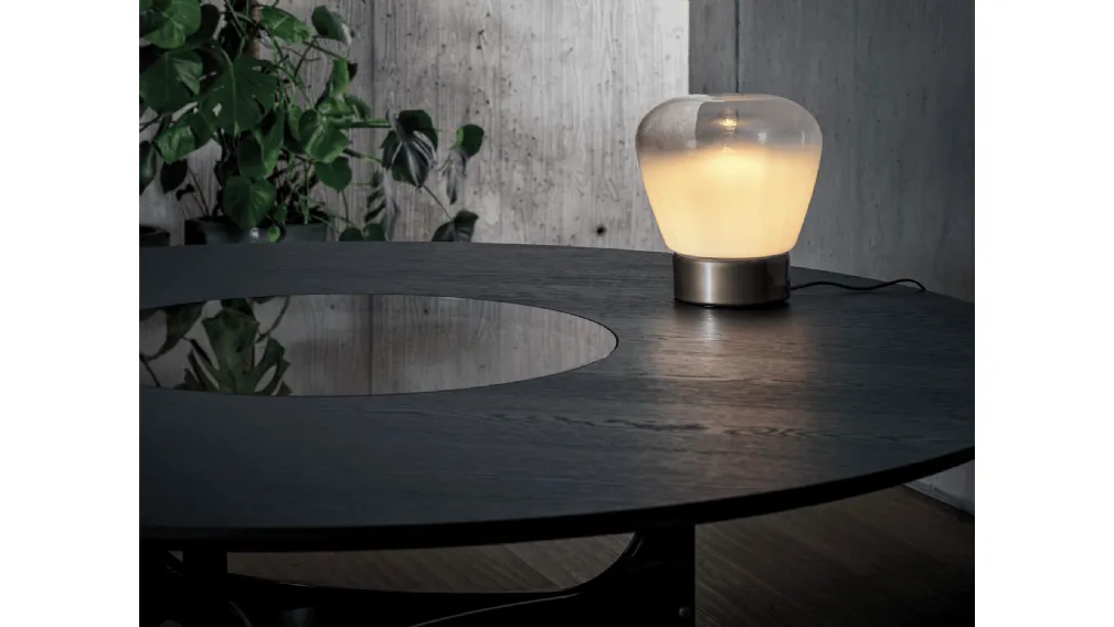 La struttura a bracciale in acciaio laccato conferisce solidità e stabilità al tavolo, mentre il piano può essere scelto tra diverse opzioni: legno impiallacciato, cristallo lucido o antigraffio, e supermarmo. Disponibile in tre versioni, il tavolo può essere configurato come fisso o ring, con un piano centrale girevole incassato in cristallo lucido, opaco antigraffio o supermarmo.