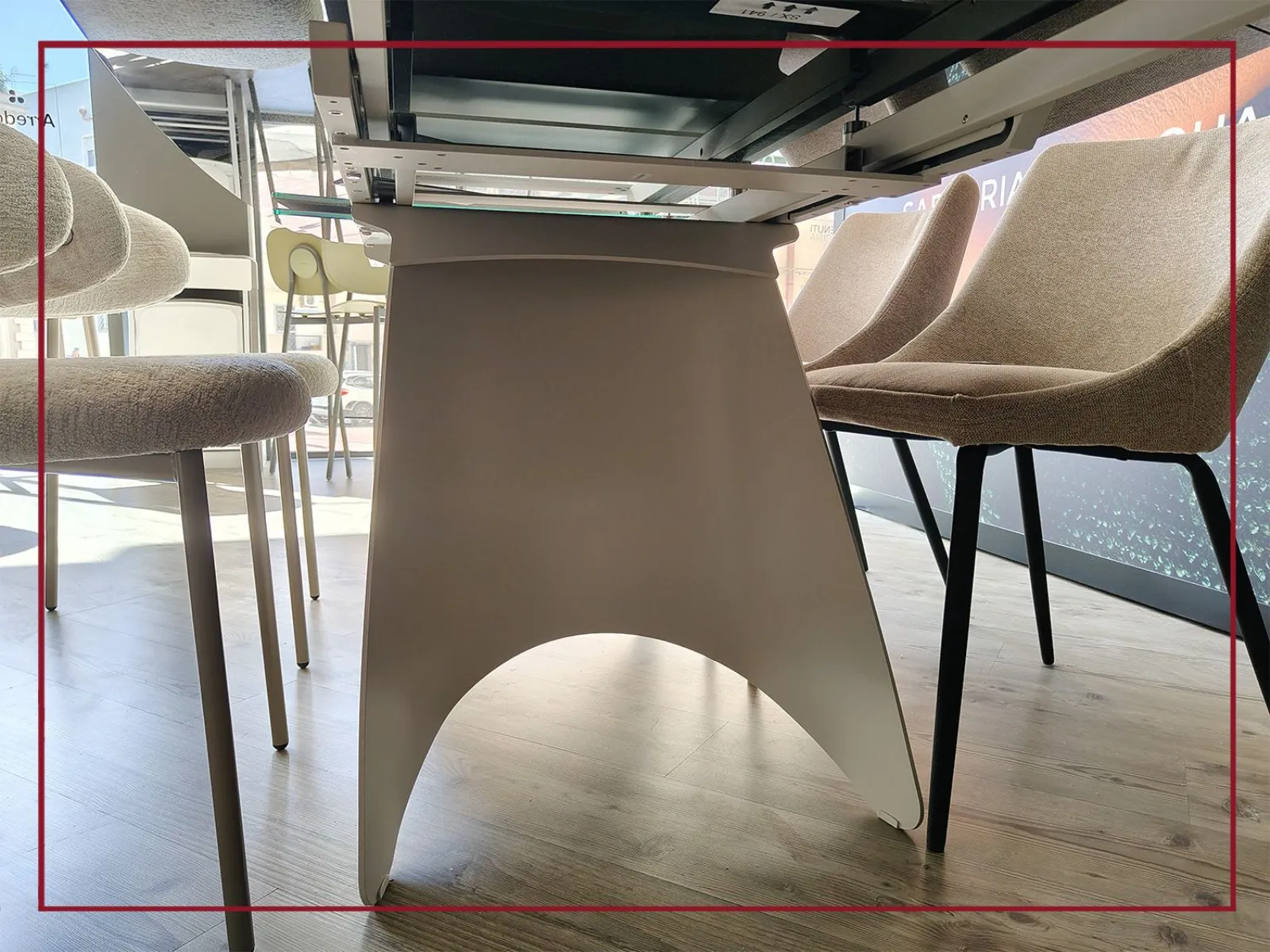 La sua struttura in lamiera curvata, leggera e quasi sospesa, richiama l’immagine di una ballerina sulle punte, conferendo al tavolo una presenza raffinata e dinamica.