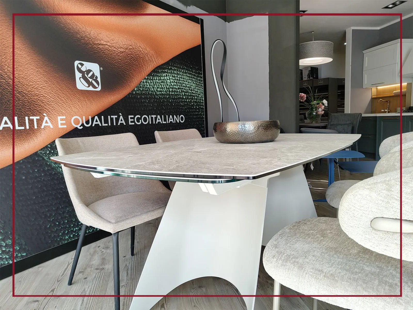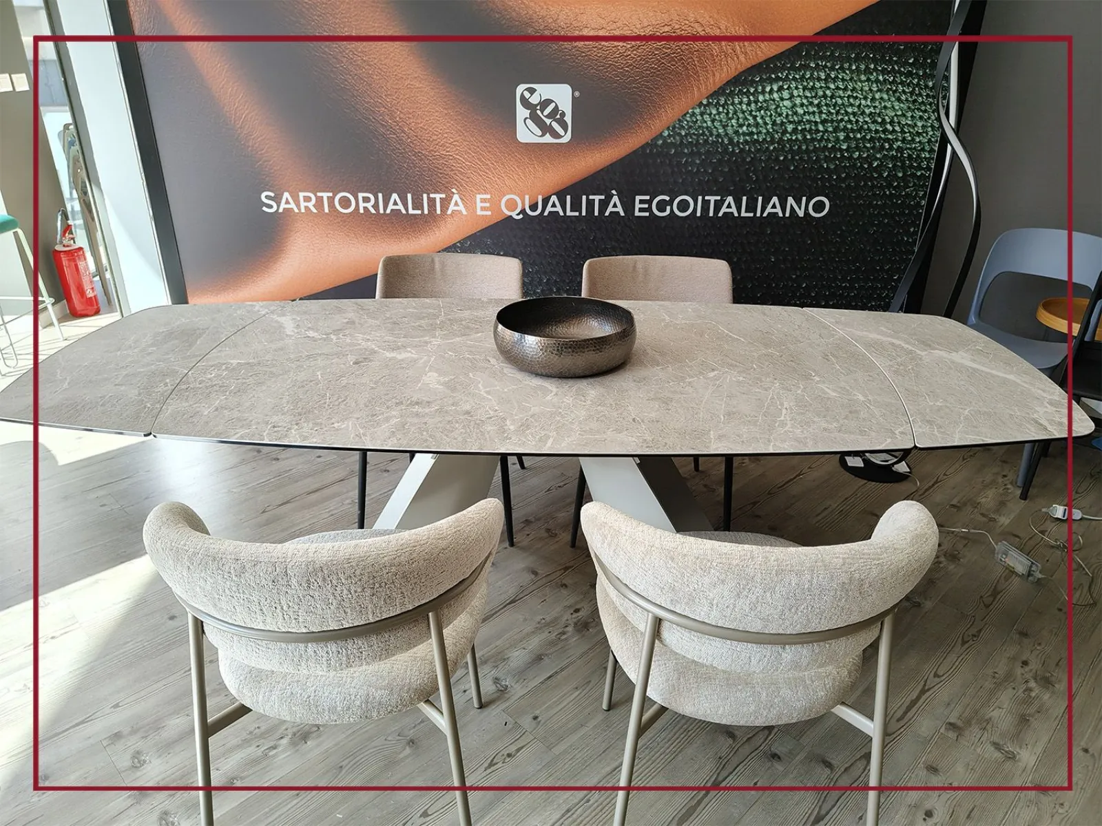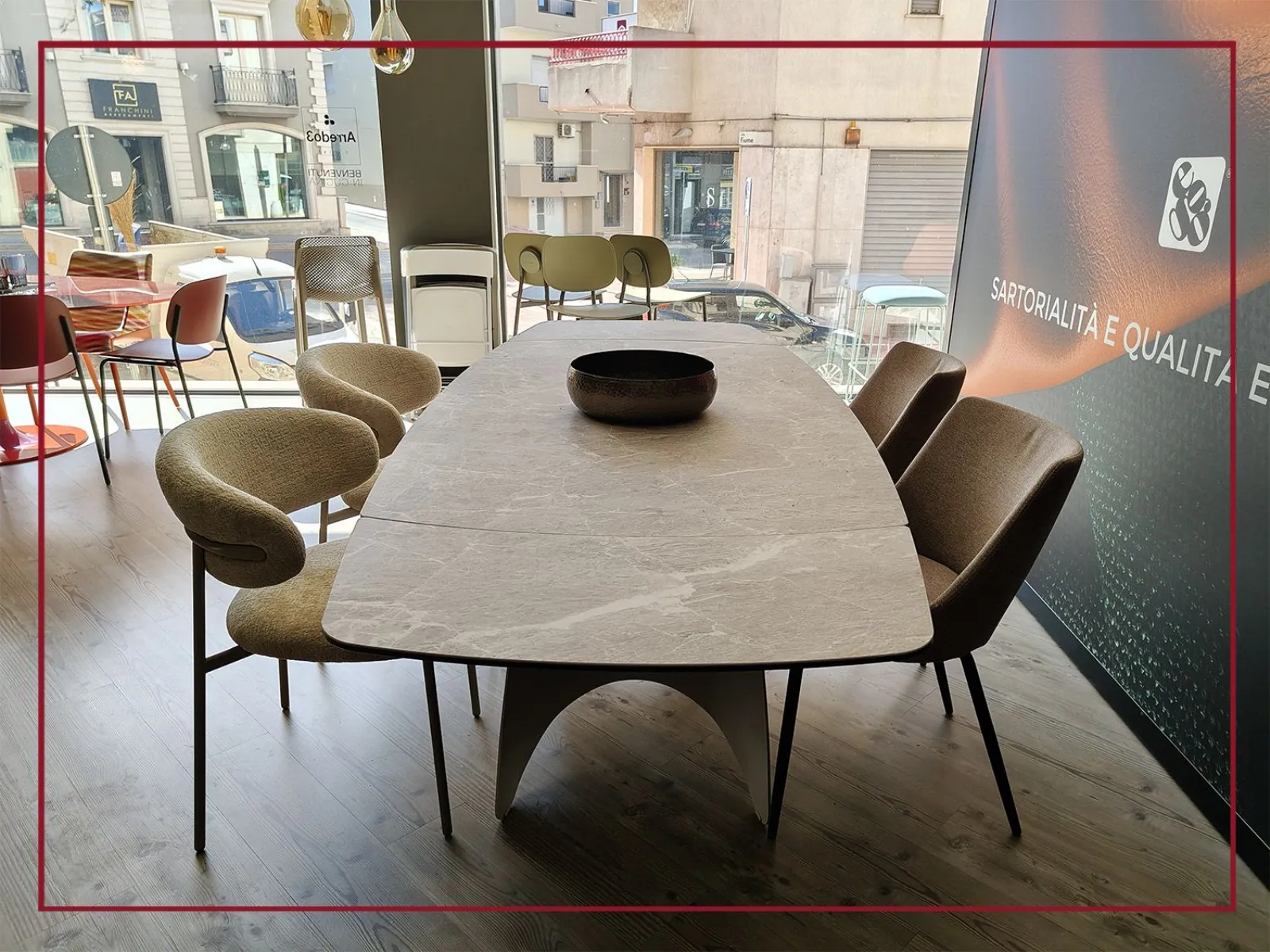 Il piano ovale, in ceramica di grande pregio, si estende con naturalezza grazie a due allunghe laterali che permettono di accogliere fino a dodici persone, trasformando ogni occasione in un momento conviviale senza rinunciare allo stile.