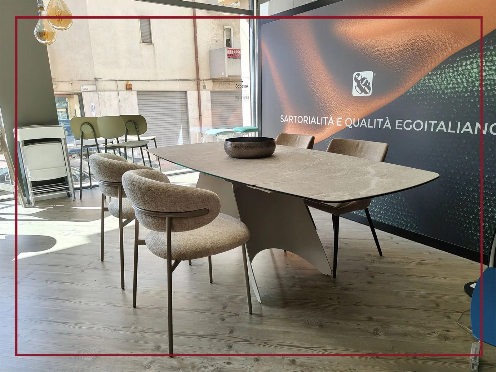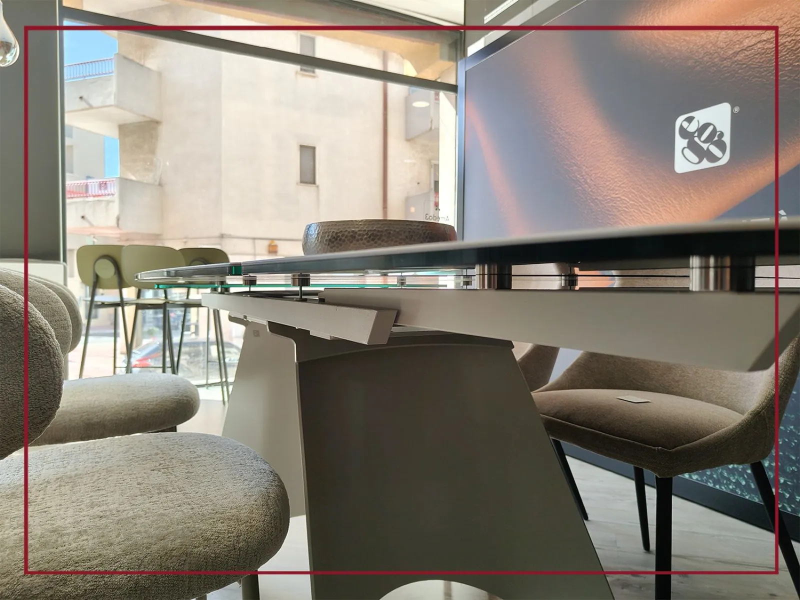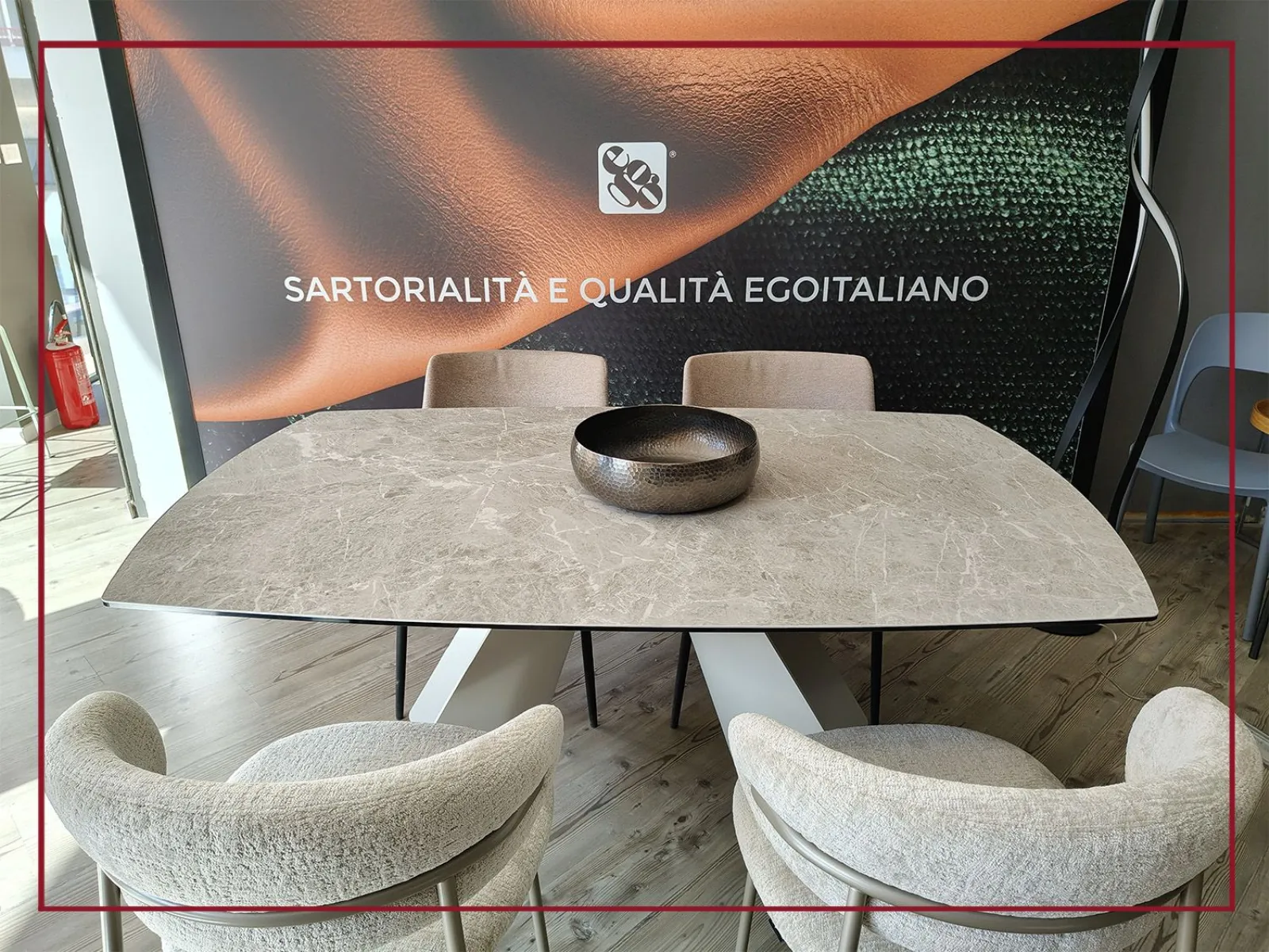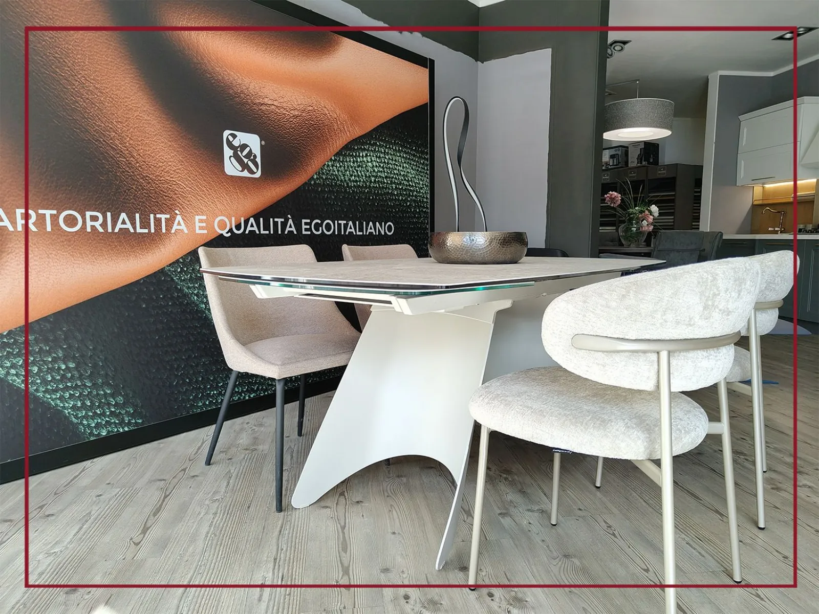 Il piano ovale, in ceramica di grande pregio, si estende con naturalezza grazie a due allunghe laterali che permettono di accogliere fino a dodici persone, trasformando ogni occasione in un momento conviviale senza rinunciare allo stile.